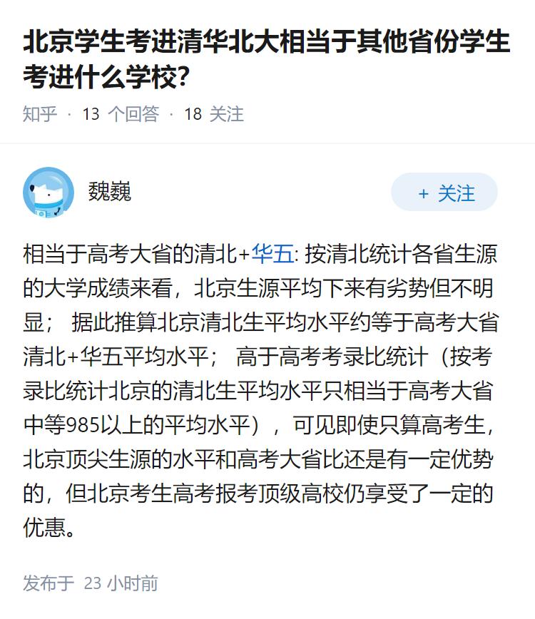 北京学生考进清华北大相当于其他省份学生考进什么学校?