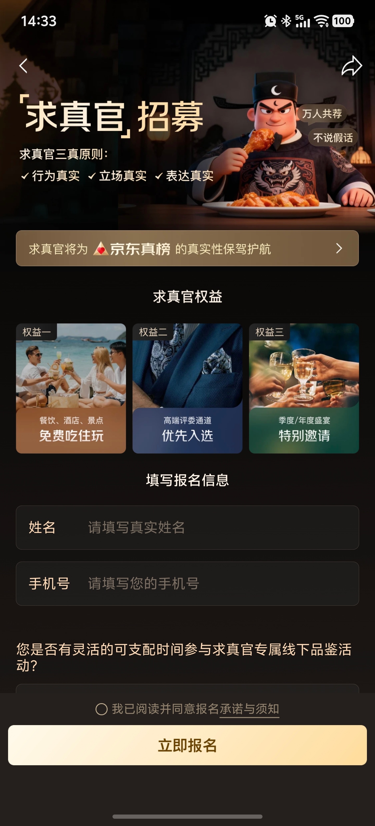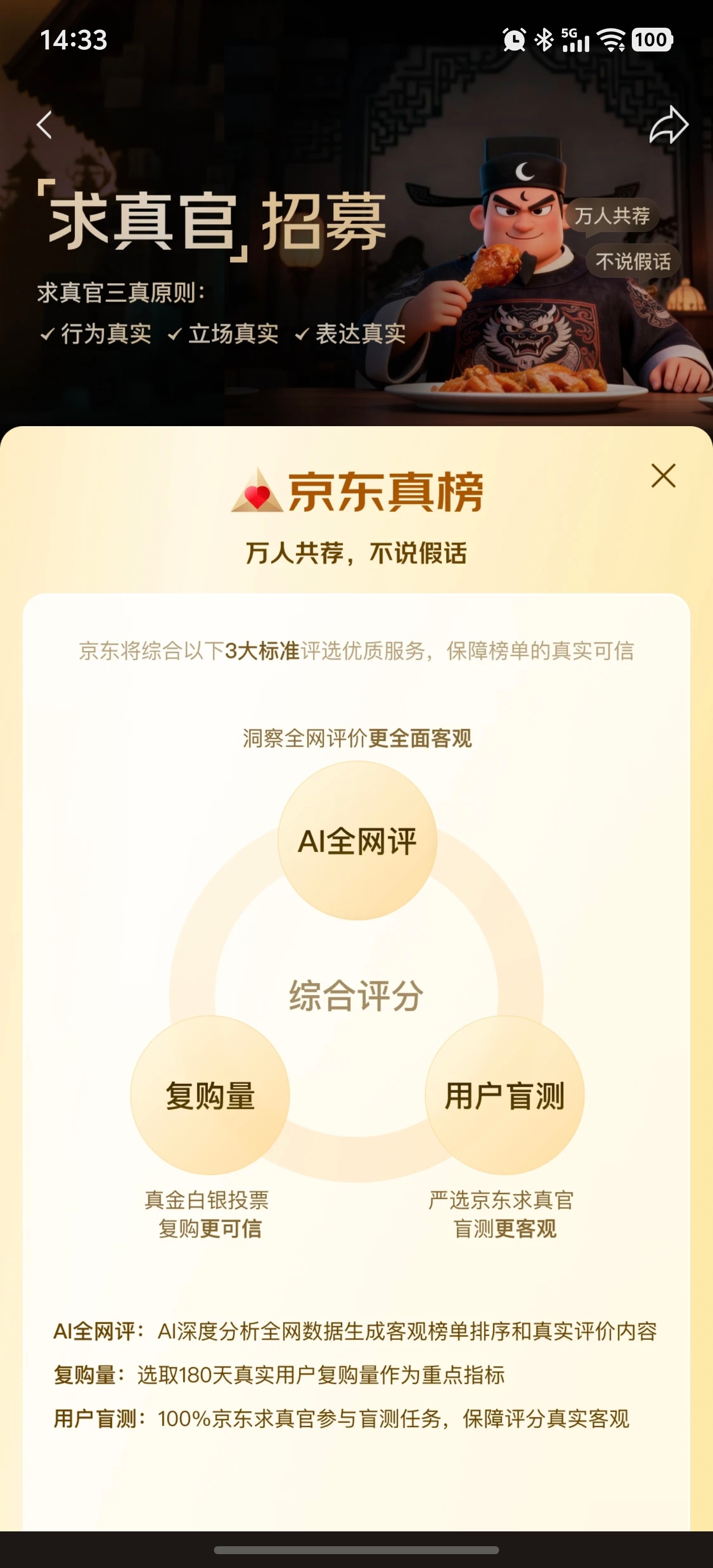 作为常年测数码的博主,对“真实”真的很敏感!京东这次搞大事,全国招募10万求真官,免费吃住玩还不套路,我直接火速报名~本以为是普通薅羊毛,没想到规则还挺严:“买吃分离”盲测,随机分配不看品牌,只凭真实体验打分,还得遵守行为、立场、表达都真实的“三真原则”。加上AI全网评+7亿用户复购数据背书,京东真榜是真要做到“万人共荐,不说假话”啊!