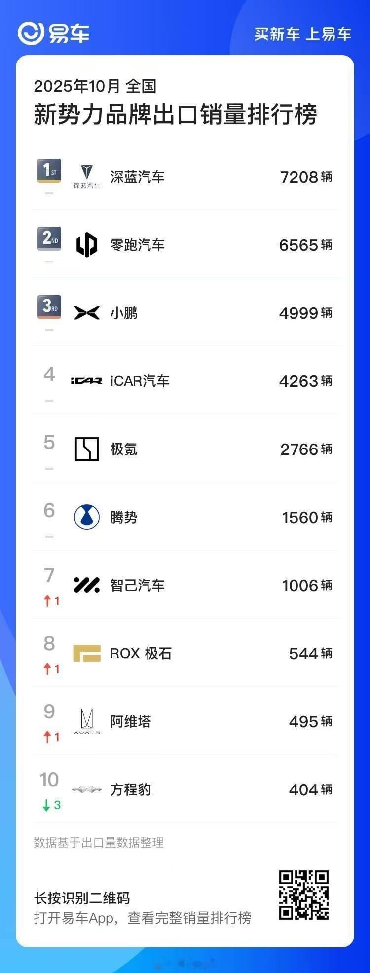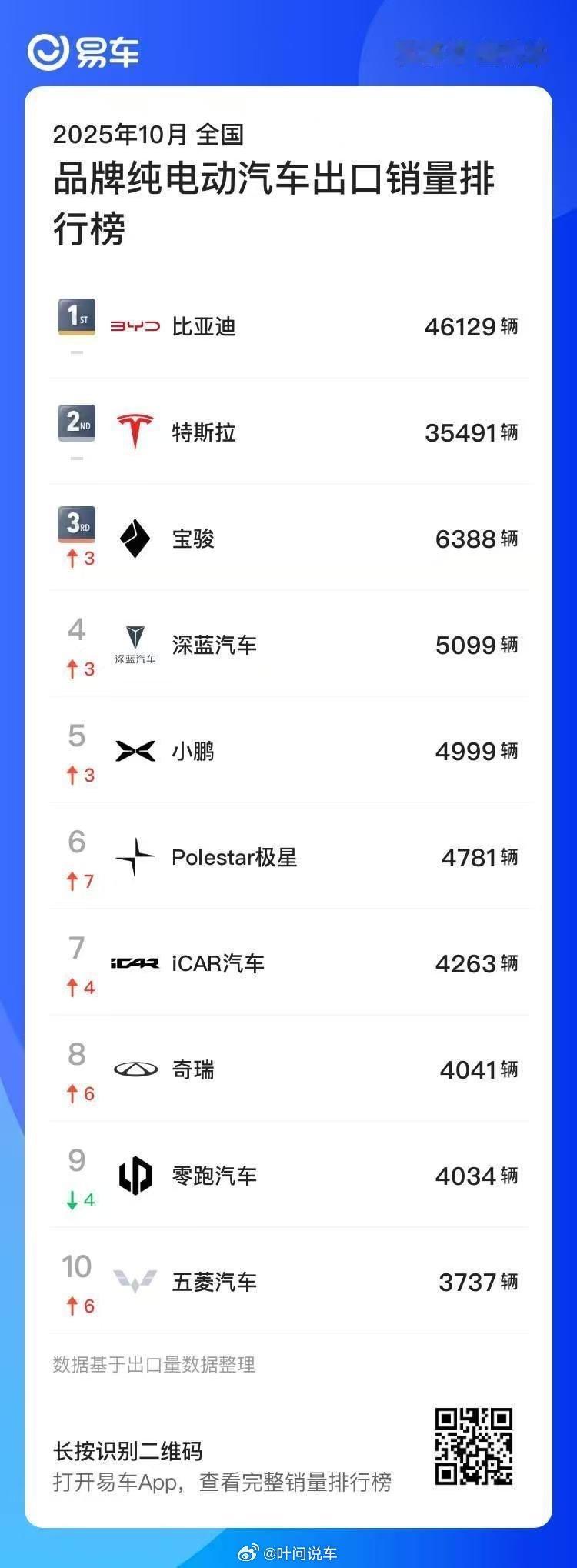 【10月品牌纯电动/新势力品牌出口销量盘点】
