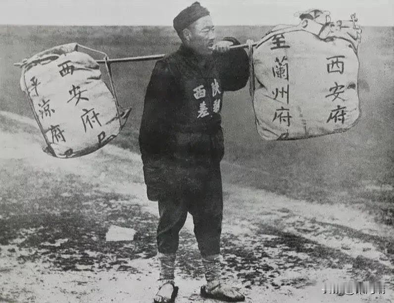 清朝末年(约1900年)陕西省的一名邮递员。 根据邮袋上的汉字,这些包裹是从陕西寄往甘肃省的。 这位邮递员穿着草鞋,跋涉在崎岖的地形上,徒步递送邮件,并将所有包裹扛在肩上或背上——这足以证明这项工作的艰辛。