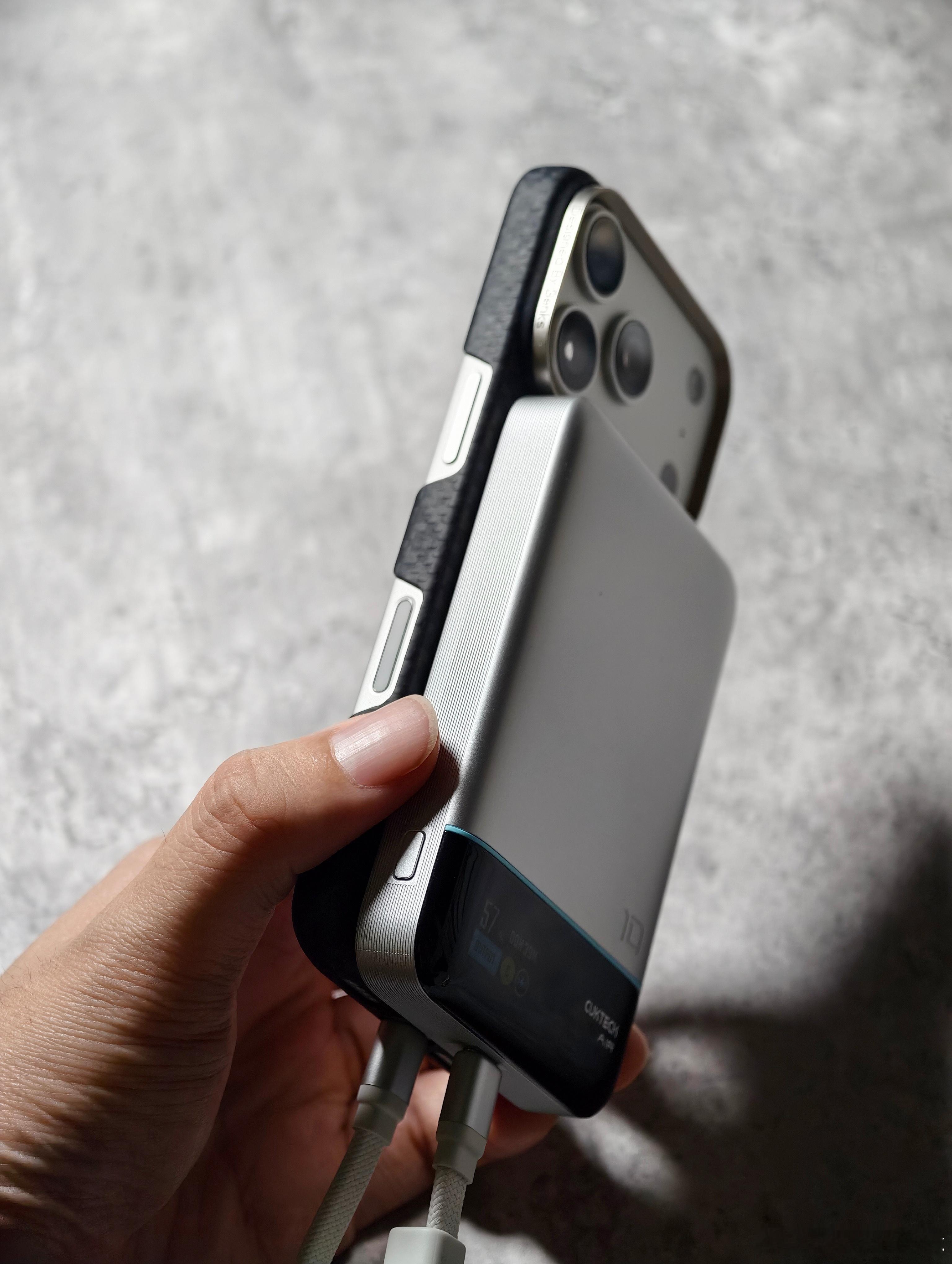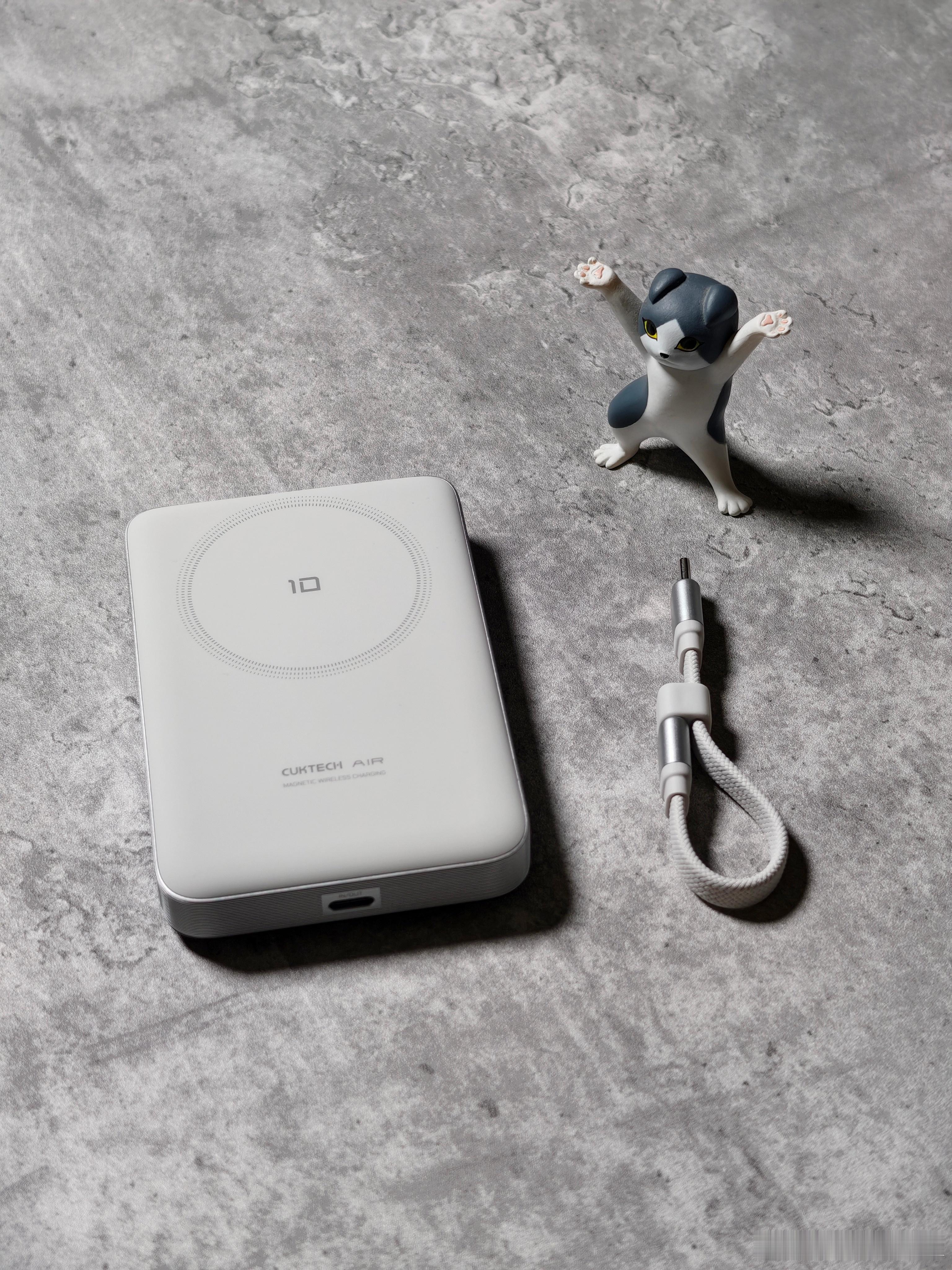 新玩具,酷态科10号超级磁吸电能卡。用磁吸壳之后确实移动电源也得磁吸才比较方便,超薄那些5000mAh不够用就得看这个了,单C口,自带一根可收纳的5A线,贴在手机上用有线会自动切换有线充电,出差带这个目前是最方便的。