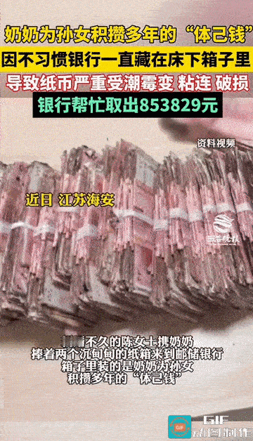 “这回银行立大功了!”江苏海安,一位奶奶多年悄悄为孙女积攒下一笔“体己钱”,由于老人不习惯将钱存银行,这笔钱一直被奶奶藏在床底箱子里,谁知当孙女新婚回来看望她,准备将这笔钱作为她的祝福送给孙女时,两人却惊讶地发现,箱内纸币已严重受潮霉变、粘连,部分甚至破损,惊喜瞬间变成了惊吓! 来源:【西安晚报】 “体己钱”,这个充满温情的词汇,承载着奶奶对孙女深沉的爱。这笔钱是她对孙女未来的一份心意,也是她心里最深的牵挂! 奶奶选择将钱藏在床下的箱子里,这是老一辈人特有的习惯——他们总觉得钱财放在眼前最踏实! 当奶奶满心欢喜地搬出箱子,准备给新婚的孙女一个惊喜时,打开箱子的那一刻,两人都愣住了! 眼前的纸币已经严重受潮发霉,有的黏在一起,有的边缘已经破损,原本崭新的钞票面目全非! 惊喜瞬间变成了惊吓! 然而,孙女没有丝毫埋怨。她深知,这破损的纸币背后,是奶奶一点一滴攒下的爱! 这份爱,不会因纸币的霉变而贬值。她立刻带着奶奶一起前往银行,寻求专业的帮助! 面对两箱清点难度极大的残损币,邮储银行海安市吉庆营业所的工作人员没有推诿! 从上午9:20开始,银行调配全部可用力量,投入这场特殊的“抢救”行动! 工作人员们分工协作,小心翼翼地对每一张纸币进行鉴别、分类、清点和封装! 这个过程极其耗时耗力,但他们没有丝毫懈怠,因为知道这不仅仅是一笔钱,更是一位老人对孙女的深情! 直到下午15:18,经过银行工作人员六个多小时耐心细致的清点,最终为奶奶挽回了853829元。这两箱“沉睡”已久的祝福终于被成功“唤醒”! 当工作人员将兑换结果告知她们时,奶奶脸上露出了如释重负的笑容! 这笔“沉睡”多年的钱,终于恢复了它原本的价值。而奶奶的心,也放下了! 老人藏在家中的不只是钱,更是一份随时可以拿出的、沉甸甸的爱! 一位网友感慨:“奶奶不仅有钱,还真的疼孙女,能把八十多万塞在床底多年,这种用心已经不是简单的省吃俭用了,是把孙女当成生命里最软的一块地方。” 然而,这种存放方式背后存在着不少风险。除了受潮霉变,还可能遭遇火灾、虫蛀、盗窃等意外! 这也给众多家庭提了个醒:如果家里有老人喜欢存放现金,最好提前帮他们做好安全规划! 比如准备防潮箱,放几包干燥剂,并定期检查翻看!