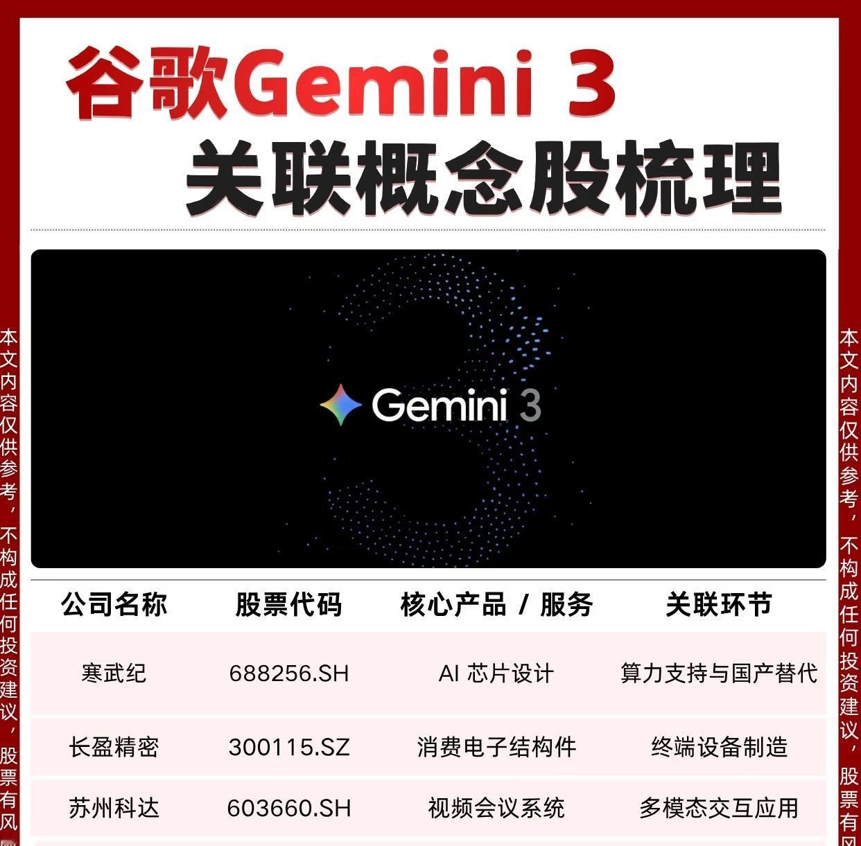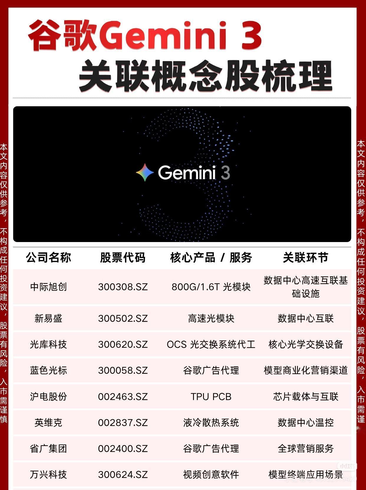 以下是关于谷歌Gemini 3关联概念股梳理的总结: 一、主要公司及关联环节 1. 中际旭创(300308.SZ) - 核心产品:800G/1.6T光模块 - 关联环节:数据中心高速互联基础设施 2. 新易盛(300502.SZ) - 核心产品:高速光模块 - 关联环节:数据中心互联 3. 光库科技(300620.SZ) - 核心产品:OCS光交换系统代工 - 关联环节:核心光学交换设备 4. 蓝色光标(300058.SZ) - 核心业务:谷歌广告代理 - 关联环节:模型商业化营销渠道 5. 沪电股份(002463.SZ) - 核心产品:TPU PCB(印刷电路板) - 关联环节:芯片载体与互联 6. 英维克(002837.SZ) - 核心产品:液冷散热系统 - 关联环节:数据中心温控 7. 省广集团(002400.SZ) - 核心业务:谷歌广告代理 - 关联环节:全球营销服务 8. 万兴科技(300624.SZ) - 核心产品:视频创意软件 - 关联环节:模型终端应用场景 二、主要公司及关联环节 1. 寒武纪(688256.SH) - 核心产品:AI芯片设计 - 关联环节:算力支持与国产替代 2. 长盈精密(300115.SZ) - 核心产品:消费电子结构件 - 关联环节:终端设备制造 3. 苏州科达(603660.SH) - 核心产品:视频会议系统 🔍 谷歌Gemini 3 概念股一览(投资需谨慎!) 谷歌最新大模型 Gemini 3 带动一系列相关产业链公司受到关注,涵盖 AI芯片、光模块、数据中心、广告营销、视频应用、散热技术 等多个关键环节! 🌟 重点公司包括: - 中际旭创、新易盛、光库科技 → 提供高速光模块与光交换设备,支撑数据中心超高速互联; - 沪电股份 → 生产TPU用的PCB板,是芯片互联的关键载体; - 英维克 → 液冷方案解决数据中心散热问题; - 蓝色光标 & 省广集团 → 谷歌广告代理商,助力模型商业化推广; - 万兴科技 → 视频创意工具,有望成为Gemini 3的终端应用之一; - 寒武纪 → AI芯片设计,聚焦国产算力与自主可控; - 长盈精密 → 消费电子零部件,服务终端硬件制造; - 苏州科达 → 视频会议系统,涉及多模态交互应用场景。 ⚠️ 风险提示:以上信息仅供参考,不作为投资依据,股市有风险,投资需谨慎!