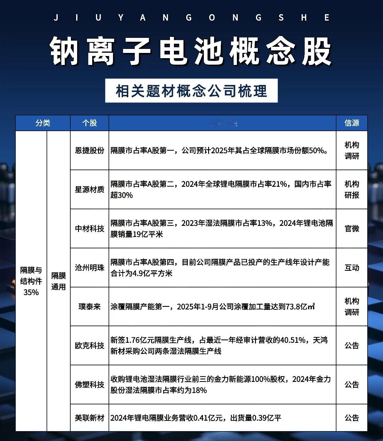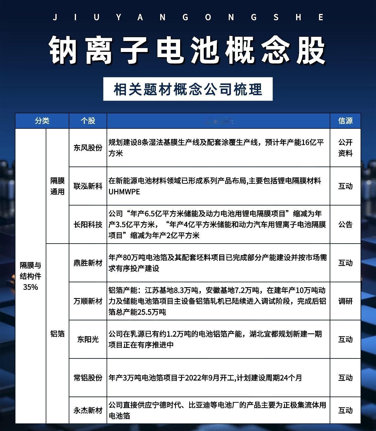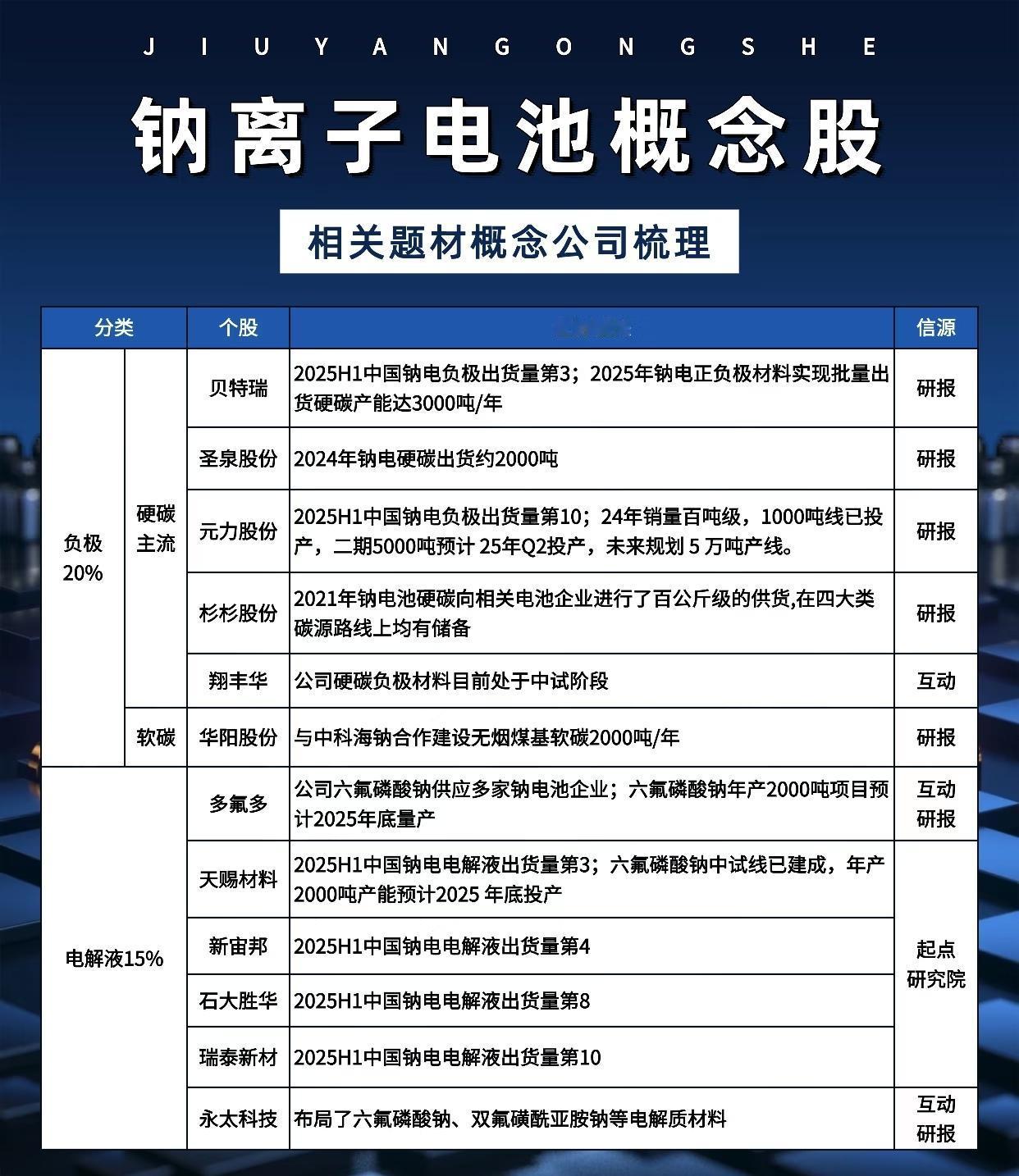 以下是对“钠离子电池概念股”相关题材概念公司的系统梳理: 一、钠离子电池(电芯)相关企业(出货量排名为主) 1. 维科技术:预计2025年全球钠电池出货量排名第1,全球聚阴离子钠电池出货量第1。 2. 普利特(孙公司:海四达钠星):2025年全球钠电池出货量第2,聚阴离子钠电池出货量第2。 3. 比亚迪:2025年全球钠电池出货量第3,聚阴离子钠电池出货量第3。 4. 宁德时代:2025年全球钠电池出货量第4。 5. 天能股份(子公司:天能钠电):2025年全球钠电池出货量第5,聚阴离子钠电池出货量第4。 二、钠电正极材料企业 (一)聚阴离子化合物(占比高,出货量领先) 1. 容百科技:2025H1中国钠电正极材料出货第2,聚阴离子出货第3;是宁德时代钠电正极粉料的第一供应商;2025年6000吨中试线,2026年预计新增10-15万吨,2030年目标百万吨级。 2. 万润新能:2025H1中国钠电正极材料出货第6,聚阴离子出货第2;部分型号已实现数百吨出货。 3. 同兴科技:与屏山县政府合作建设年产10万吨钠电正极材料及6GWh电芯项目。 4. 当升科技:2025H1中国聚阴正极材料出货第10。 (二)层状氧化物(主流技术路线之一) 1. 当升科技:2025H1中国钠电正极材料出货第4,层氧正极材料出货第2;与中伟股份有3-10万吨/年前驱体合作,聚阴离子产品用于工程车辆。 2. 容百科技:2025H1中国钠电层氧正极材料出货第4。 3. 振华新材:2025H1中国钠电正极材料出货第13,层氧第6;钠电正极材料已实现百吨级销售。 4. 雪天盐业(参股美特新材20%):美特新材2025H1中国钠电正极材料出货第19,层氧出货第10;产能7500吨/年。 5. 格林美:五元钠电层状氧化物前驱体已通过量产认证。 (三)普鲁士蓝/白(占比较小) 1. 美联新材(控股美彩新材51.1%):计划产能18万吨/年,其中5500吨项目已完成1000吨。 2. 七彩化学(参股美彩新材31.5%):同上。 三、钠电负极材料企业 硬碳(主流负极材料) 1. 贝特瑞:2025H1中国钠电负极出货量第3;2025年正负极材料实现批量出货,硬碳产能达3000吨/年。 2. 圣泉股份:2024年钠电硬碳出货约2000吨。 3. 元力股份:2025H1中国钠电负极出货量第10;2024年销量百吨级,1000吨线已投产,二期5000吨预计2025年Q2投产,远期规划5万吨。 4. 杉杉股份:2021年起向电池企业百公斤级供货,具备四大碳源路线储备。 5. 翔丰华:硬碳负极材料处于中试阶段。 软碳 1. 华阳股份:与中科海钠合作建设无烟煤基软碳2000吨/年。 四、钠电电解液企业 1. 多氟多:供应多家钠电池企业六氟磷酸钠,年产2000吨项目预计2025年底量产。 2. 天赐材料:2025H1中国钠电电解液出货量第3;六氟磷酸钠中试线已建成,2000吨产能预计2025年底投产。 3. 新宙邦:2025H1中国钠电电解液出货量第4。 4. 石大胜华:2025H1中国钠电电解液出货量第8。 5. 瑞泰新材:2025H1中国钠电电解液出货量第10。 五、隔膜与结构件企业(占比35%) 主要隔膜企业 1. 恩捷股份:隔膜市占率A股第一,预计2025年占全球隔膜市场份额50%。 2. 星源材质:隔膜市占率A股第二,2024年全球市占率21%,国内超30%。 3. 中材科技:隔膜市占率A股第三,2023年湿法隔膜市占率13%,2024年锂电池隔膜销量19亿平米。 4. 沧州明珠:隔膜市占率A股第四,现有生产线年设计产能合计4.9亿平方米。 5. 璞泰来:涂覆隔膜产能A股第一,2025年1-9月涂覆加工量达73.8亿㎡。 隔膜通用及其他 1. 东风股份:规划建设8条湿法基膜及涂覆线,预计年产能16亿平方米。 2. 联泓新科:在新能源电池材料领域布局,包括锂电隔膜材料UHMWPE。 3. 长阳科技:调整储能及动力电池用锂电隔膜项目规模,原项目缩减后继续推进。 六、铝箔(电池集流体关键材料) 1. 鼎胜新材:年产80万吨电池箔及配套坯料项目,部分产能已按需投产。 2. 万顺新材:江苏基地8.3万吨铝箔,安徽基地7.2万吨,另有在建10万吨动力及储能电池箔项目,主设备已调试,完成后总产能25.5万吨。 3. 东阳光:乳源已有约1.2万吨电池铝箔产能,湖北宜都新建项目有序推进。 4. 常铝股份:年产3万吨电池箔项目2022年9月开工,建设周期24个月。 5. 永杰新材:直接供应宁德时代、比亚迪等,产品主要为正极集流体用电池箔。