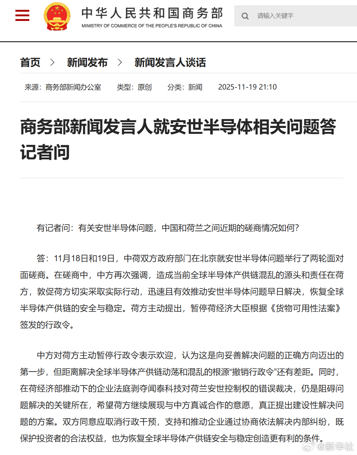 【商务部新闻发言人就安世半导体相关问题答记者问】有记者问:有关安世半导体问题,中国和荷兰之间近期的磋商情况如何?答:11月18日和19日,中荷双方政府部门在北京就安世半导体问题举行了两轮面对面磋商。在磋商中,中方再次强调,造成当前全球半导体产供链混乱的源头和责任在荷方,敦促荷方切实采取实际行动,迅速且有效推动安世半导体问题早日解决,恢复全球半导体产供链的安全与稳定。荷方主动提出,暂停荷经济大臣根据《货物可用性法案》签发的行政令。中方对荷方主动暂停行政令表示欢迎,认为这是向妥善解决问题的正确方向迈出的第一步,但距离解决全球半导体产供链动荡和混乱的根源“撤销行政令”还有差距。同时,在荷经济部推动下的企业法庭剥夺闻泰科技对荷兰安世控制权的错误裁决,仍是阻碍问题解决的关键所在,希望荷方继续展现与中方真诚合作的意愿,真正提出建设性解决问题的方案。双方同意应取消行政干预,支持和推动企业通过协商依法解决内部纠纷,既保护投资者的合法权益,也为恢复全球半导体产供链安全与稳定创造更有利的条件。