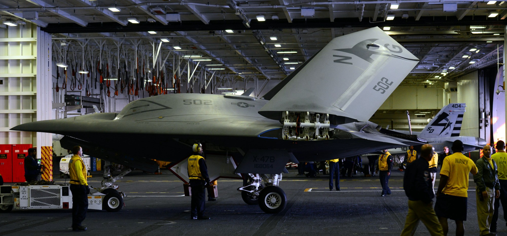 2013年5月,在布什号机库中调运的X-47B大型舰载无人机当时还有不少人看到这图会垂头丧气当时几乎所有人都不会想到,会有今天这番光景