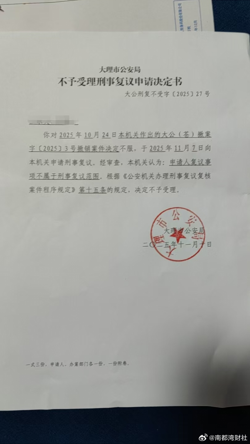 【:家属申请对案件的立案监督】大理苍山8岁男童小凯参加夏令营走失身亡,警方撤案后迎来新进展。11月19日,男童母亲郭女士告诉南都N视频记者,大理市公安局认为申请人复议事项不属于刑事复议范围,对该案刑事复议申请决定不予受理。郭女士表示,家属正准备材料,继续申请对该案的立案监督。南都此前报道,今年8月9日,一名8岁孤独症男童参加“明日之光”研学营时,在大理镇阳和茶厂附近走失。8月13日17时许,救援人员在大理镇清碧溪北侧山涧发现走失男童,已无生命体征。经现场勘验和综合调查,排除外力损伤致死,初步排除刑事案件可能。