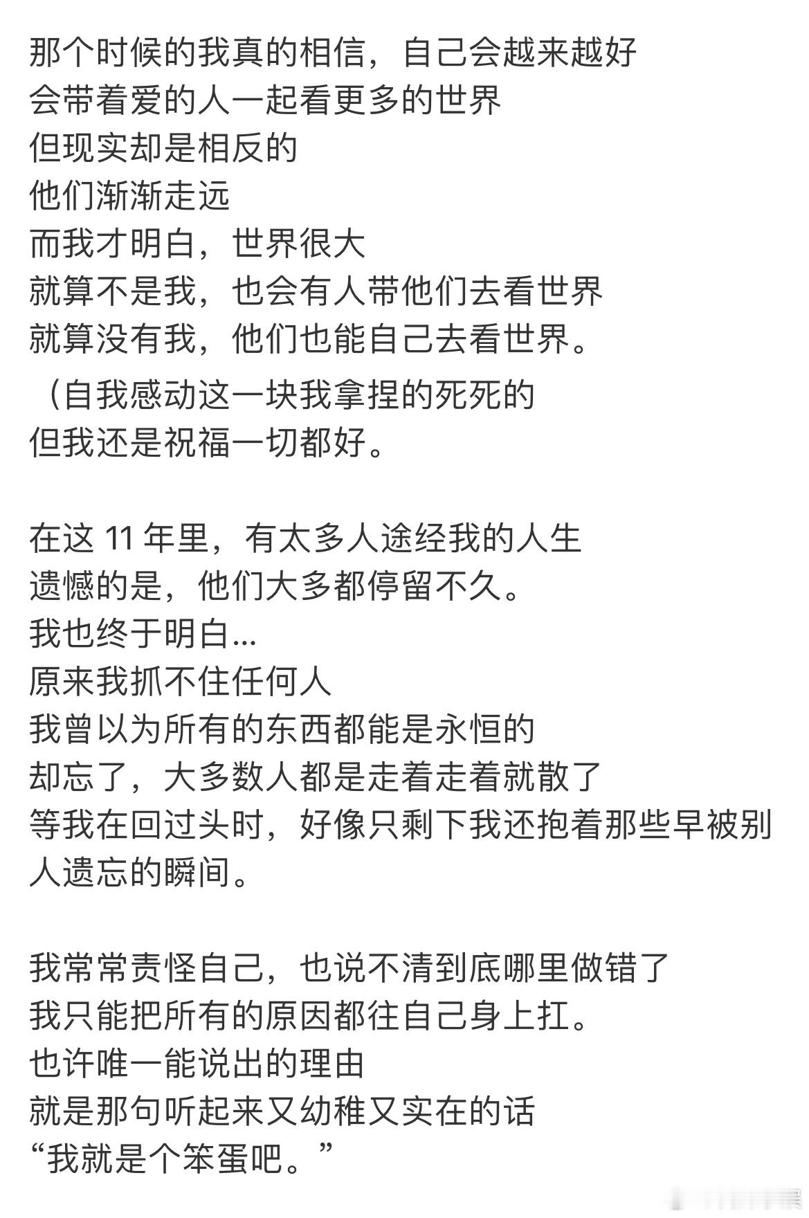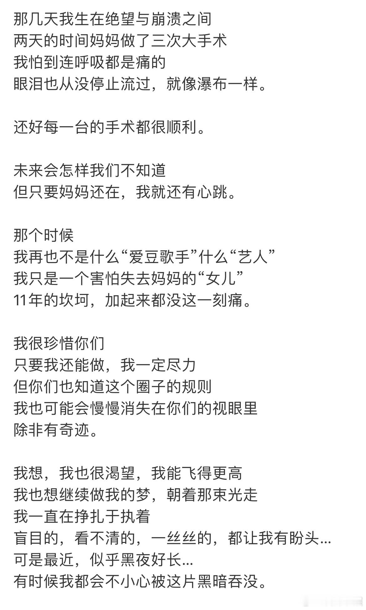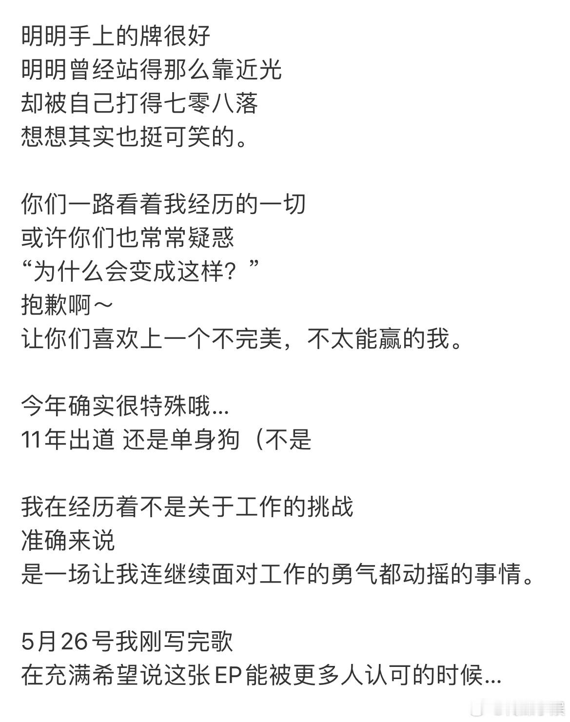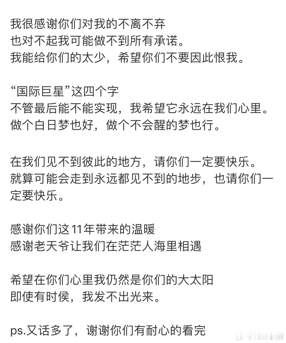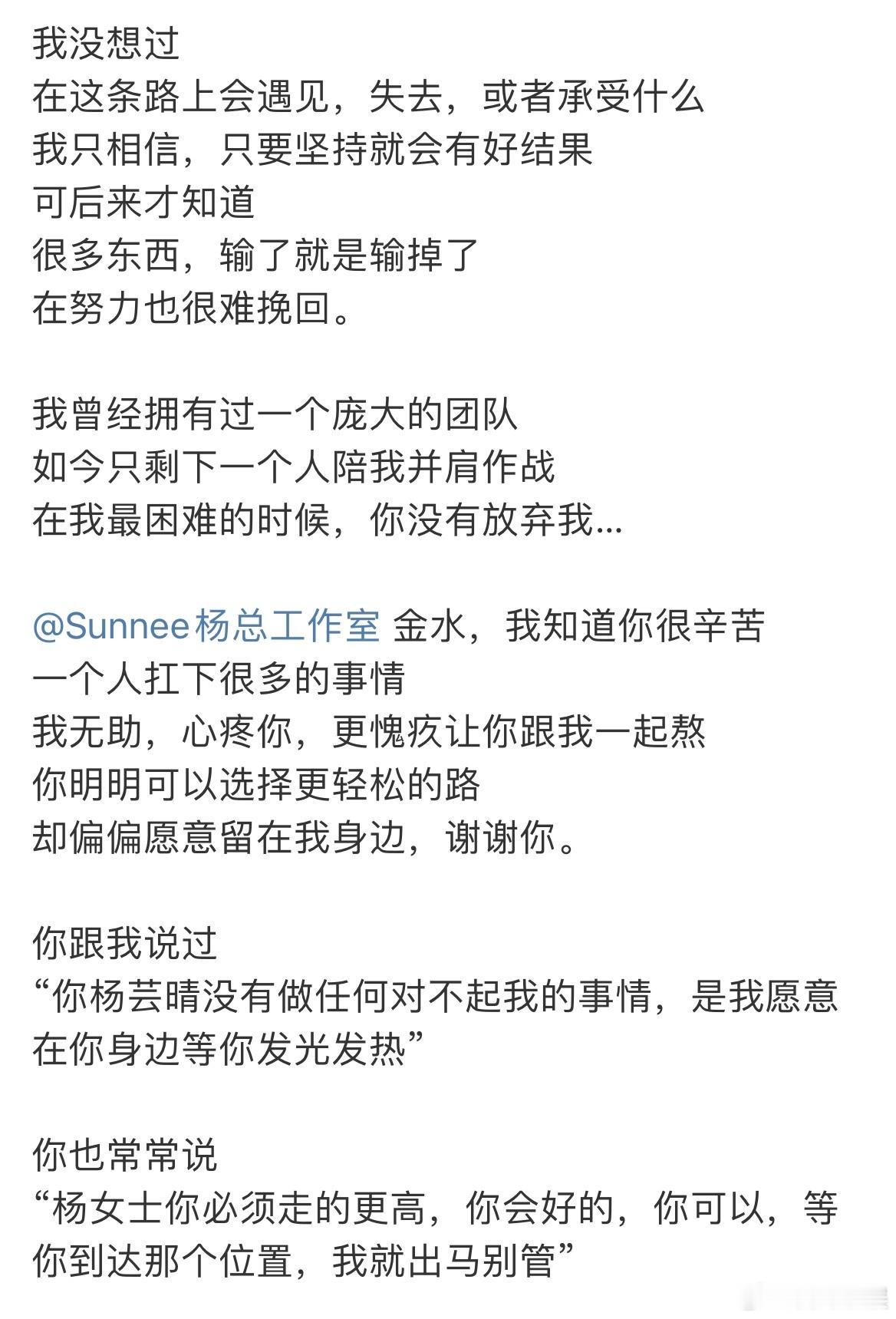 下午收到Sunnee杨芸晴粉丝投稿时我在外面,我原以为这是一篇出道11周年感谢粉丝的长文……没想到等晚上回去认认真真读完之后,瞬间就有些鼻酸,眼眶也湿了。特别巧的是我算了一下今年也是我做这行的第11年,所以她提到“无数次想放弃”、“除了这个以外我什么都不会”、“只要坚持就会有好结果”……我都特别能感同身受,尤其是今年自己也遇到了很多事情之后,你会发现,有些东西真的不是你自己可以把控的。原本看完之后想说的话有很多,但是真正要写的时候又不知道该从何说起。你在文中说“抱歉 让你们喜欢上一个不完美,不太能赢的我”,可我想说的是没有人是完美的,也没有任何规则说就一定要赢啊!还有你最后一直在说“请大家一定要快乐”,而我却希望你不管做什么的前提,也一定是你要快乐。千言万语汇成最近很流行的一句话:别回头,别停留,往前走,有好多人站在你身后呢!