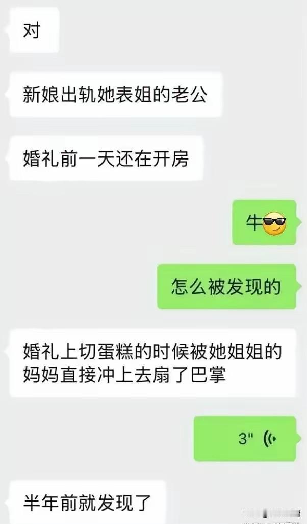是的,只不过这新娘狠了点,出轨对象是表姐夫,这情况被发现。一般人都忍不住