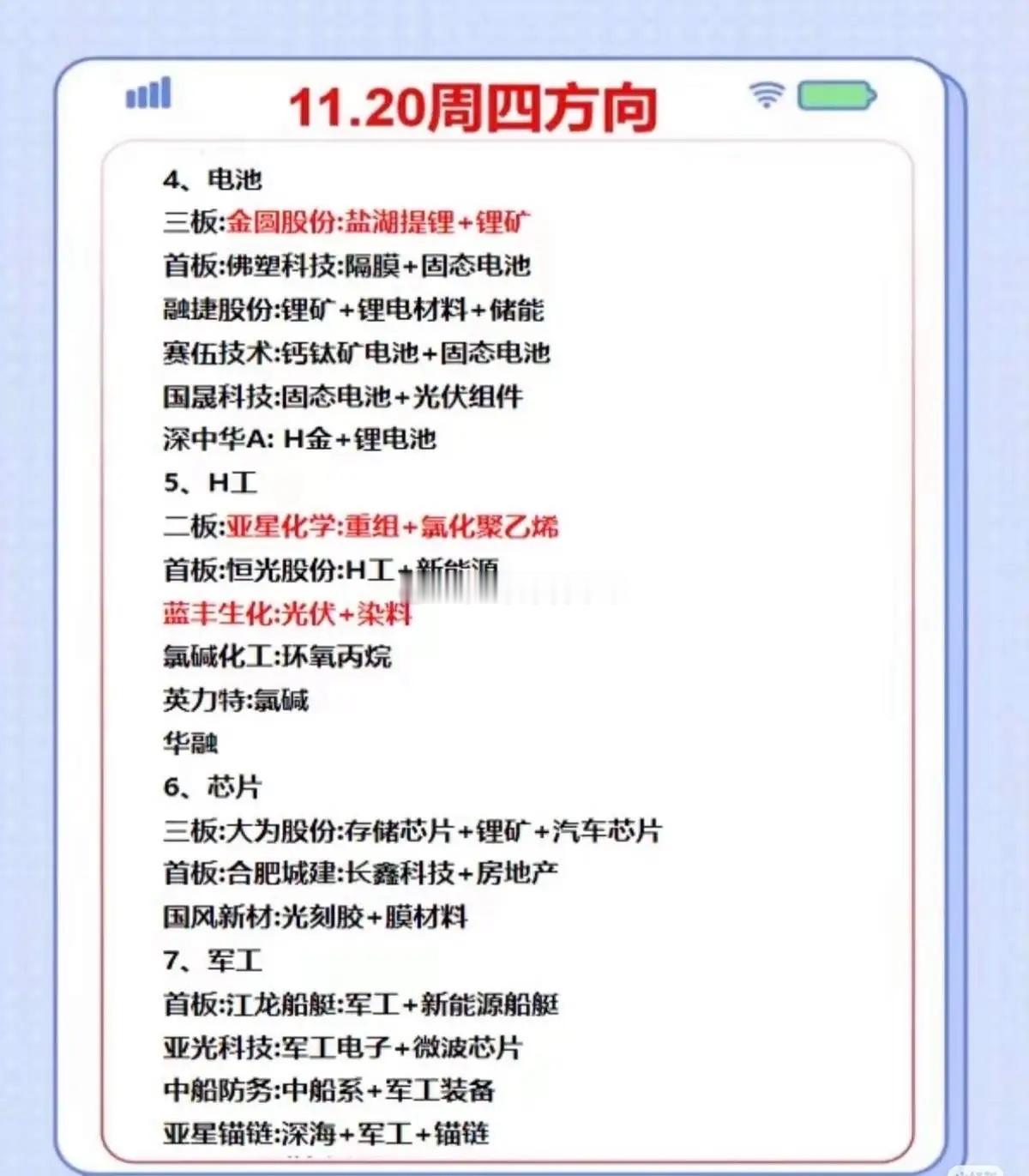 11月20日(周四)的股票投资方向分析,涵盖多个热点板块及个股:1. 消费、水产、福建/海峡:消费板块重点关注六板真爱美家(服装家纺)、四板华瓷股份(日用陶瓷)等;水产板块有四板中水渔业(远洋渔业)及首板多只渔业股;福建/海峡板块包括六板九牧王(服装+海峡)、四板航天发展(商业航天+海峡)等。2. 电池、H工、芯片、军工:电池板块有三板金圆股份(盐湖提锂)、首板佛塑科技(固态电池)等;H工板块二板亚星化学(重组+化工)等;芯片板块三板大为股份(存储芯片)等;军工板块首板江龙船艇(军工+新能源船艇)等。3. AI应用、有机硅、其他:AI应用包括三板浪潮软件(AI智能体)、榕基软件(AI数据+海峡);有机硅有首板晨光新材、合盛硅业(有机硅+光伏);其他板块覆盖智能自控(新型工业化)、泰永长征(智能电网)、梦天家居(智能家居+芯片)等多元题材,部分个股以红色标注为重点。整体聚焦短线强势股及热点概念,红色字体多为关键推荐标的。