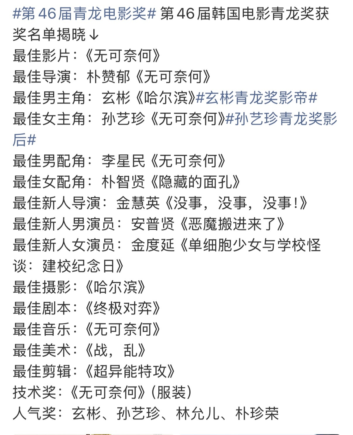 这届青龙奖获奖名单给人感觉韩影没片了?