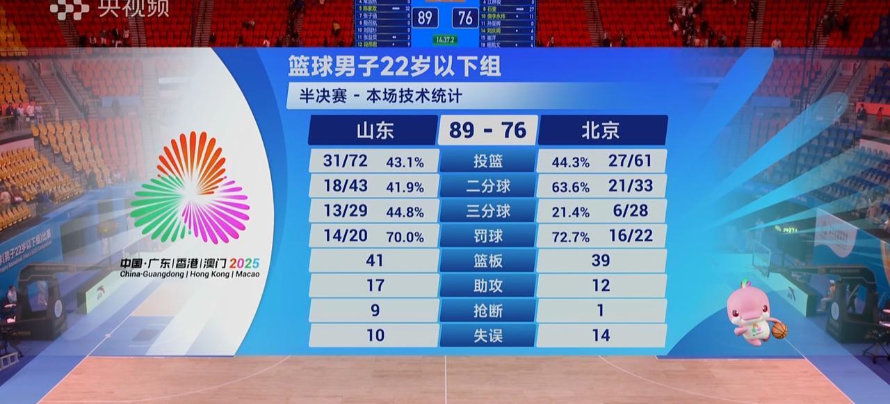 11月19日晚全运会U22男篮半决赛,山东队以89比76战胜北京队。 球队数据:山东队三分球29投13中,命中率44%,斩获39分;北京队三分球28投6中,仅得18分。 球员数据 :山东队陈家政表现突出,三分球9投6中,拿下全场最高的32分,还贡献了6个篮板。管子煜得到22分,曲笑宇10分,段昂君9分。北京队方面,虽有球员砍下27分4个篮板,但整体火力不足,未能取胜。 值得点赞的是,中国男篮的名宿巩晓彬再次出山,担任了这支U22山东队的主教练,他在场边运筹帷幄,指点江山,队员精神抖擞,一鼓作气。让观众再次目睹了他的风采。原北京队的名将王骁辉也担任了U22北京队的助教,在场边鼓励队员。让人不禁想起了他在以往比赛中勇猛精进,人挡杀人,佛挡杀佛的辉煌时代。 山东全运会男篮 山东男篮CBA