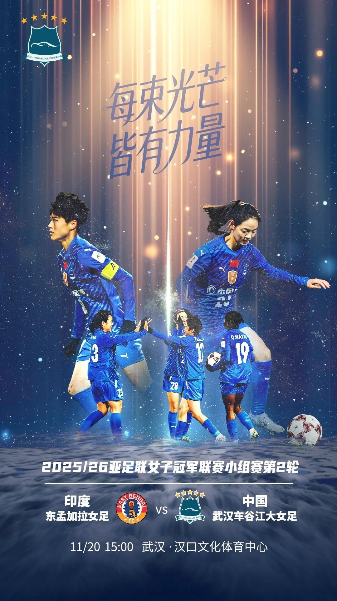 2025/2026亚足联女足亚冠联赛小组赛第2轮对阵双方: 东孟加拉女足vs武汉车谷江大女足比赛时间:2025-11-20 15:00比赛场地:汉口文化体育中心直播平台:爱奇艺体育、咪咕视频期待首胜,武汉女足加油!
