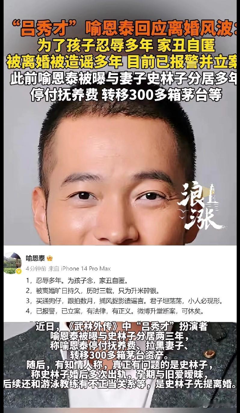 吕秀才喻恩泰怒撕离婚谣言!忍了好几年,这次直接报警立案 谁能想到“温文尔雅吕秀才”也有这么刚的一天!喻恩泰刚发博硬刚离婚谣言,说自己为了孩子忍了好几年,结果被造谣“停抚养费、转移300箱茅台”,现在直接报警立案了! 之前传他和老婆分居、被离婚,结果知情人士爆料是对方婚内多次出轨,孕期都和旧爱暧昧,还是对方先提的离婚。 喻恩泰这波回应直接放狠话:“君子坦荡荡,小人必现形”,连“买通狗仔跟拍造谣”都点出来了,看来是真被气到了。 谁能想到《武林外传》里最文弱的秀才,现实里被泼脏水这么多年,现在终于不忍了!希望警察赶紧查清,别让老实人受这委屈。