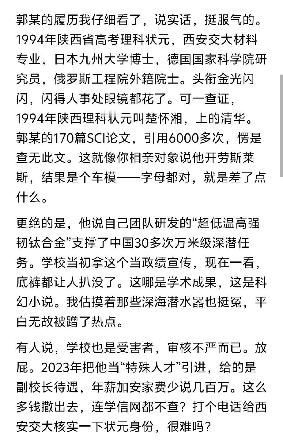 这个“骗子科学家”郭某的正面照曝光了,大家看清楚点,别让他下次还有机会骗人了。 长得一表人才,本来以为秃头是熬夜做学问,没想到净是想怎么不劳而获,140万的年薪,300万的安家费,500万的科研经费全到手了。这比缅甸电诈都来得快啊! 这个郭某高中学历,吹嘘自己是1994年的陕西理工状元,西安交大材料专业,日本九州大学博士,原创简历,170篇SCI论文全造假,高校急解聘