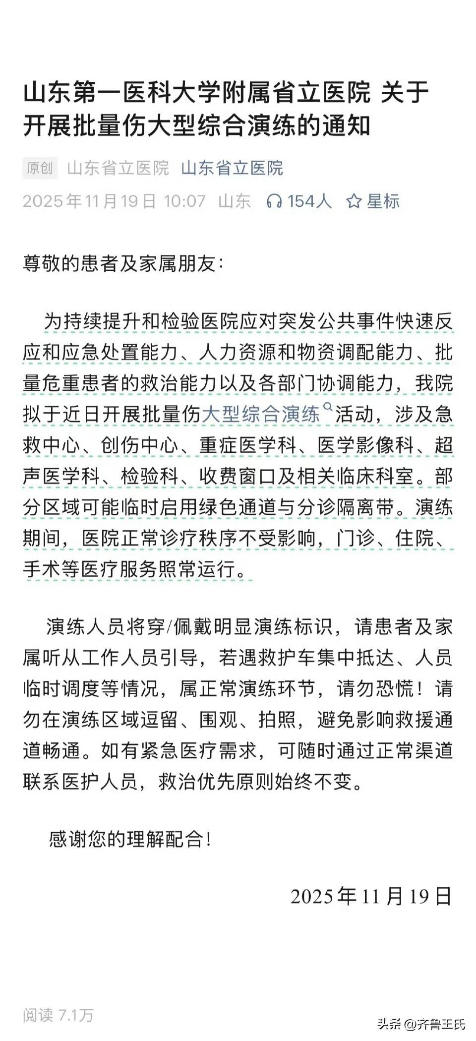 山东省立医院将开展批量伤大型综合演练,如果一次性出现大批量伤员,那只有两种情况。 要不就是我们济南市被敌方导弹点名了,要不就是战场在山东沿海,济南作为我军的后方医院。 1、济南被敌方导弹轰炸的概率不是很大,毕竟山东作为常备作战省份,济南又是北部战区的指挥中心。 如果济南被攻击了,那么东京、大阪、纽约、波士顿、洛杉矶基本就要消失了。双方就得要扔核弹了,想来美国还没有疯狂这个地步。 2、在统一的过程中,北海舰队应该负责台湾北部的拒止任务,对上的是驻日美军和驻韩美军,以及日本的海军,届时就看美日敢不敢插手了。 提前做好准备,有备无患,那一天应该不远了。