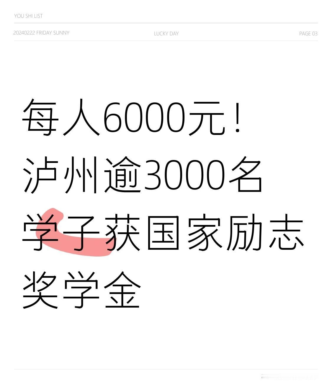 泸州逾3000名学子获每人6000元的国家励志奖学金,这消息太让人振奋了!国家励志奖学金面向二年级及以上全日制本专科生,奖励品学兼优且家庭经济困难的学生。资助面约为全日制普通本专科在校学生总数的3%,高职专科是3.3%。 能拿到这笔奖学金可不容易,竞争也不小。学生要在9月向学校申请,且同一学年不能和国家奖学金兼得。这6000元对学生来说意义重大,能解决课程选择、书本开销等问题。像四川今年就有66283名本专科生能领,希望这些获奖学子能继续努力,未来更美好! 国内奖学金 贫困生奖学金