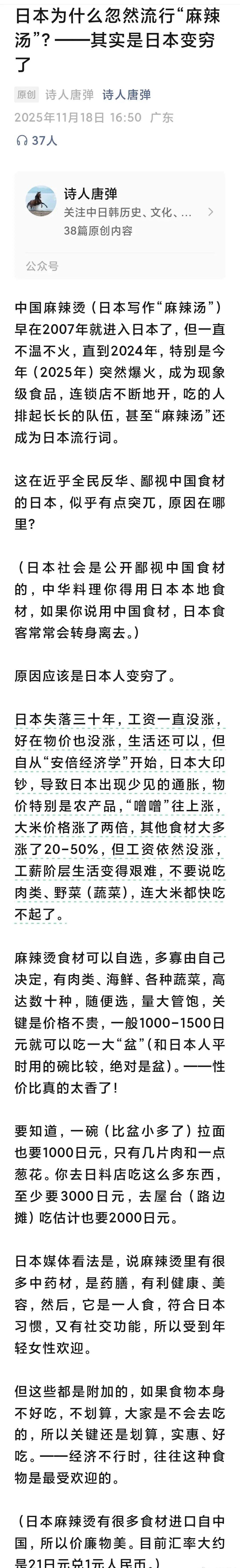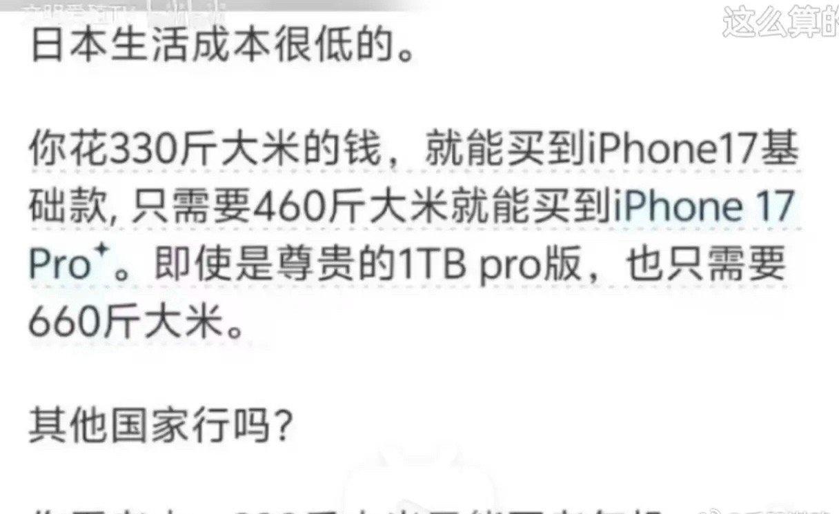 日本为什么忽然流行“麻辣汤”?——其实是日本变穷了 不知道是不是真的。但是日本大米是真的涨价了,很吓人。11月日本农林水产省发布的最新数据,普通大米5公斤装均价4316日元,合人民币198元;新米5公斤装约合人民币230元。 日本330斤大米能换个iPhone 17,中国也就换个老年机。