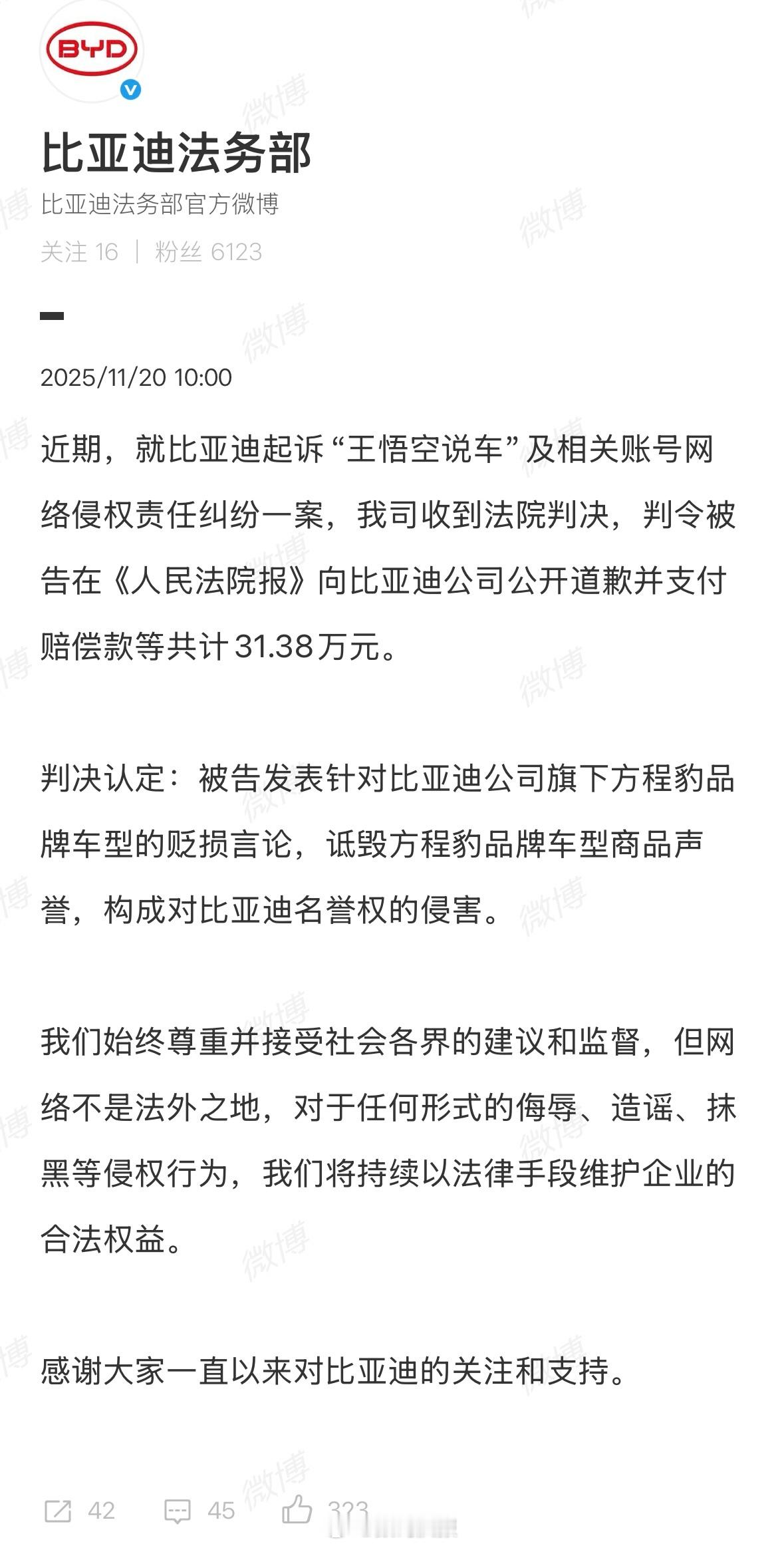 “王悟空说车”侵权比亚迪案判决,支付赔偿款等共计 31.38 万元近日,比亚迪起