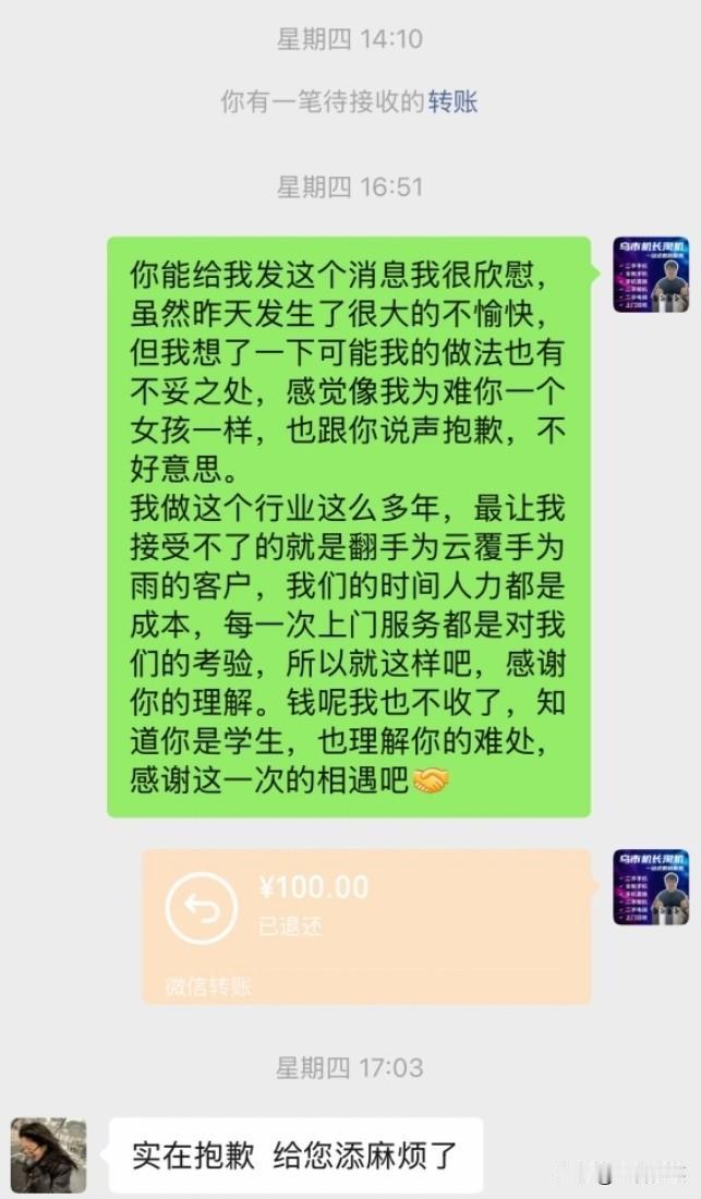 导资料的“小仙女”后续,“小仙女”是一名大学生,与店家沟通以2800元的价格将旧手机卖掉,但店家得帮她将旧手机的资料导到新手机里去。 店家导完资料后,“小仙女”坐地起价,2800元不愿意卖了,让店家给3500元,店家不同意,“小仙女”就说不卖了。 但店家帮“小仙女”导了2个小时的资料,让“小仙女”给200块钱,但“小仙女”只愿意给个10块、20块的,还嚣张地说:“你抢钱嘛!你到外面支个碗,你去抢嘛!我们大学生不跟你二道贩子一样!” 后来,帽子叔叔来了,“小仙女”的嚣张劲没了,店家让“小仙女”道个歉,不跟她收钱了,但“小仙女”拒绝道歉。 舆论发酵后,“小仙女”主动向店家道了歉,并支付了100元的上门和导资料的费用,并称“生活费没有发下来”。 店家没有收“小仙女”的转账,表示理解大学生的难处。[打脸]