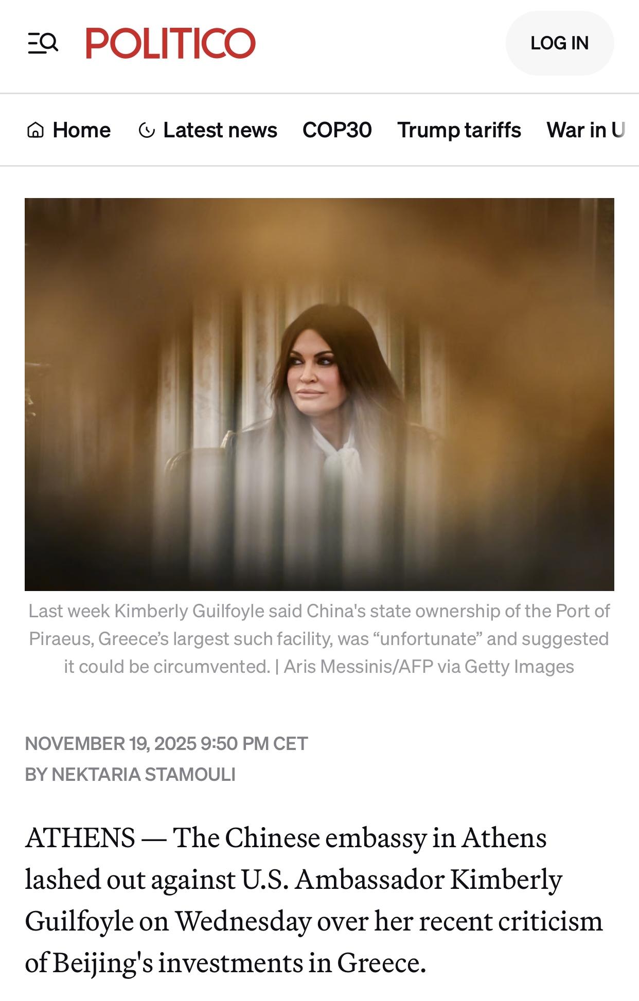 美媒:中国驻希腊大使馆发文猛批美方谬论 美国《政客》官网11月19日雅典报道:福克斯新闻前主持人、现任美国驻希腊大使表示,北京对希腊最大港口的影响是“不幸的”,可能会通过增加美国对其他基础设施的投资来抵消。 周三,中国驻雅典大使馆就美国驻希腊大使金伯利·吉尔福伊尔(Kimberly Guilfoyle,图3)近期对北京在希腊投资的批评,进行了猛烈抨击。 大使馆发言人在一份书面声明中表示,吉尔福伊尔的言论是对中希贸易关系的“恶意诽谤”,也是对“希腊内政的严重干涉”(Guilfoyle’s comments were a “malicious slander” against Sino-Greek trade relations and a “serious interference in Greek internal affairs,” an embassy spokesperson said in a written statement)。 报道说,上周,吉尔福伊尔称,中国对希腊最大港口比雷埃夫斯港(the Port of Piraeus)的国有化是“不幸的”,并暗示称”这一情况或许可以规避”,”总有办法解决的,无论你是选择在其他领域提高产出的路径,还是考虑出售比雷埃夫斯港”,她认为。 报道说,中国大使馆对此言论不以为然。声明中写道:“比雷埃夫斯港属于希腊人民;港口不是破坏地区繁荣与稳定的工具,在任何情况下都不应沦为地缘政治对抗的牺牲品”(The Chinese embassy was unimpressed. “The port of Piraeus belongs to the Greek people; it is not a tool for undermining regional prosperity and stability, and under no circumstances should it fall victim to geopolitical confrontation,” the statement read)。 声明指出,“在比雷埃夫斯港正经历快速发展之际,美国出于一己私利,正怂恿希腊终止其合同义务并出售该港口——这种做法是把自身想法强加于人的典型例子,暴露出一种企图破坏稳定的心态”。 报道说,自2009年开始的希腊漫长经济危机期间,中国对负债累累的希腊进行了大量投资,目的是将其打造成中国出口的枢纽。当时,其他西方国家的公司因希腊的财政困境和臭名昭著的官僚作风而纷纷撤离雅典。 2016年,中国国有航运公司中远集团收购了比雷埃夫斯港的多数股权。北京方面希望比雷埃夫斯港成为中国“一带一路”全球基础设施项目的关键部分,即所谓的“龙头”( the so-called dragon's head)。 “希腊比雷埃夫斯港是在希腊金融危机期间移交给中国的,因为只有中国提交了投标书”,希腊外交部发言人拉娜·佐奇奥(Lana Zochiou)周二在雅典的一次新闻发布会上表示,指出”希腊尊重过去达成的协议”。 报道说,吉尔福伊尔曾是美国福克斯新闻网(network Fox News)的一名保守派评论员,她表示,北京目前的影响力可能会被美国在其他基础设施项目上增加的投资所抵消。 报道说,事实上,雅典正在加快在埃莱夫西纳(Elefsina)开发新港口的计划,这是一个由美国支持的项目,官员们表示,该项目可以制衡中国在比雷埃夫斯的影响力。吉尔福伊尔和希腊发展部长塔基斯·塞奥多里卡科斯(Takis Theodorikakos)周二会面时讨论了这一想法,之后雅典方面开始着手实施该计划。会后,吉尔福伊尔表示:“我们期待埃莱夫西纳港能发展成为该地区的物流枢纽”。 报道的原标题是《China lashes out against US’s Greece ambassador Kimberly Guilfoyle》(中国猛烈抨击美国驻希腊大使金伯利·吉尔福伊尔)。