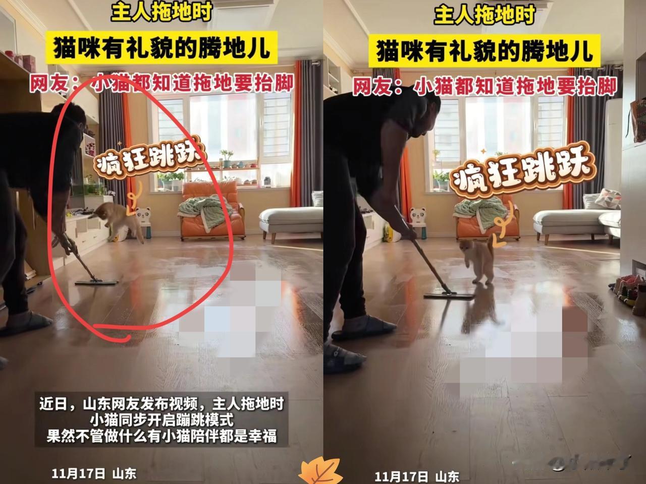 万物皆有灵性!山东,主人在家拖地时,猫咪竟然知道有礼貌的给腾地儿,主人拖到脚边秒抬爪,边躲拖把边疯狂蹦跳,硬生生把枯燥的拖地现场,玩成了自己的专属冒险岛! 这通人性的劲儿,某些只会瘫沙发的人类看了都得羞愧! 别再觉得养宠物只是解闷了,这猫咪明明在用行动教我们:最好的陪伴从不是沉默旁观,而是你认真做家务时,它用笨拙又可爱的方式陪你折腾! 主人每天早餐后必拖地除猫毛,它不吵不闹,反而跟着拖把节奏蹦跶,既怕小脚脚被杵到,又舍不得离主人半步,这份双向奔赴的热闹,比独处干活香太多! 现在总算get到养宠人的幸福感密码了,不是我们在照顾宠物,而是宠物在治愈我们的日常! 那些觉得做家务磨人的朋友,大概是没遇到这样一只把你的琐碎,当成它的乐趣的小生命吧? 原来生活的甜,从来都藏在这些被陪伴的烟火气里!