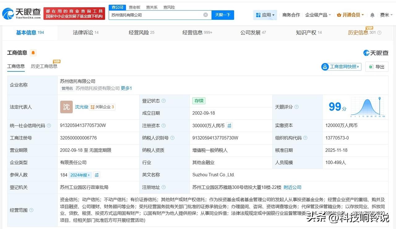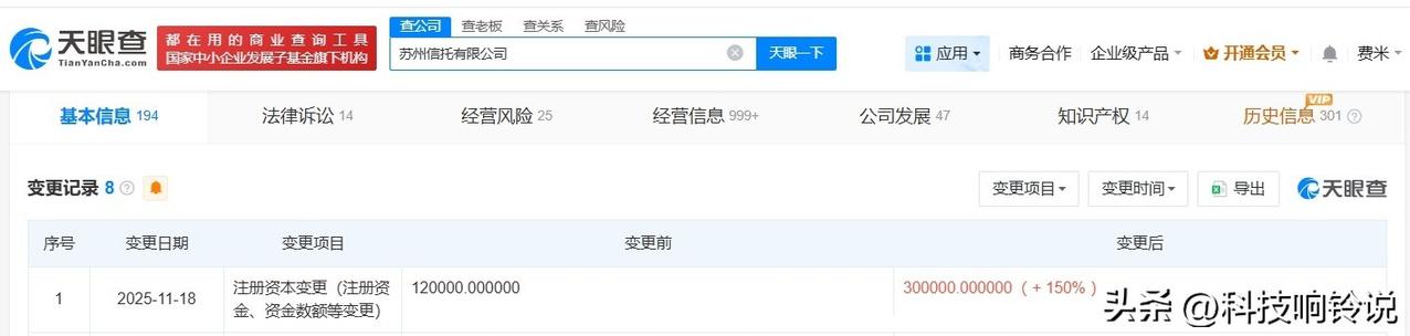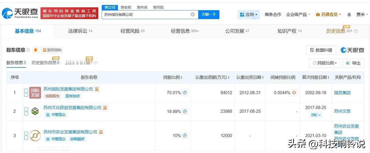 【苏州信托公司增资至30亿 增幅150%】 天眼查工商信息显示,近日,苏州信托有限公司发生工商变更,注册资本由12亿人民币增至30亿人民币,增幅150%。 该公司成立于2002年9月,法定代表人为沈光俊,经营范围包括资金信托、动产信托、不动产信托、有价证券信托等业务。股东信息显示,该公司由苏州国际发展集团有限公司、苏州文化旅游发展集团有限公司、苏州市农业发展集团有限公司共同持股。 天眼查信息:
