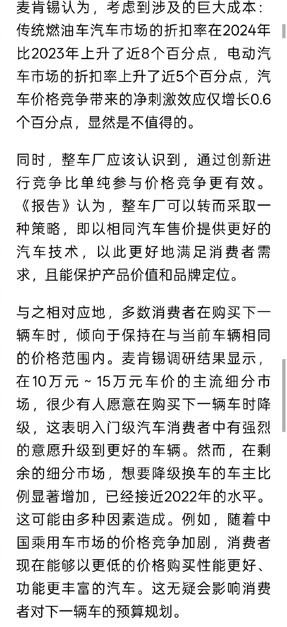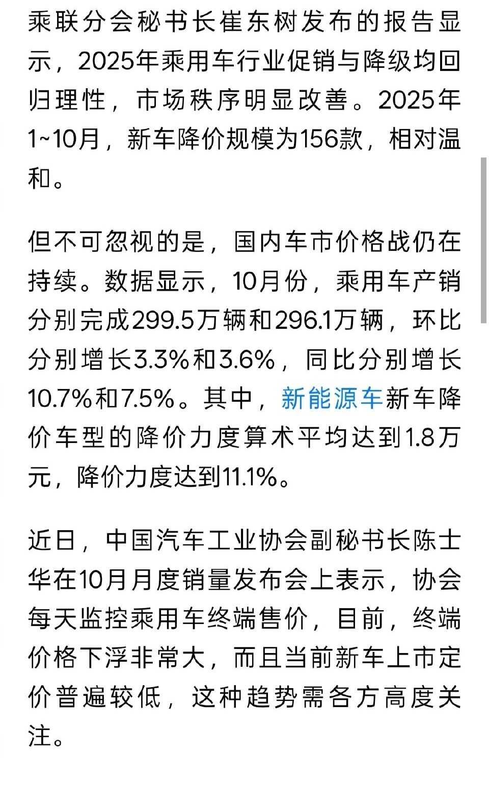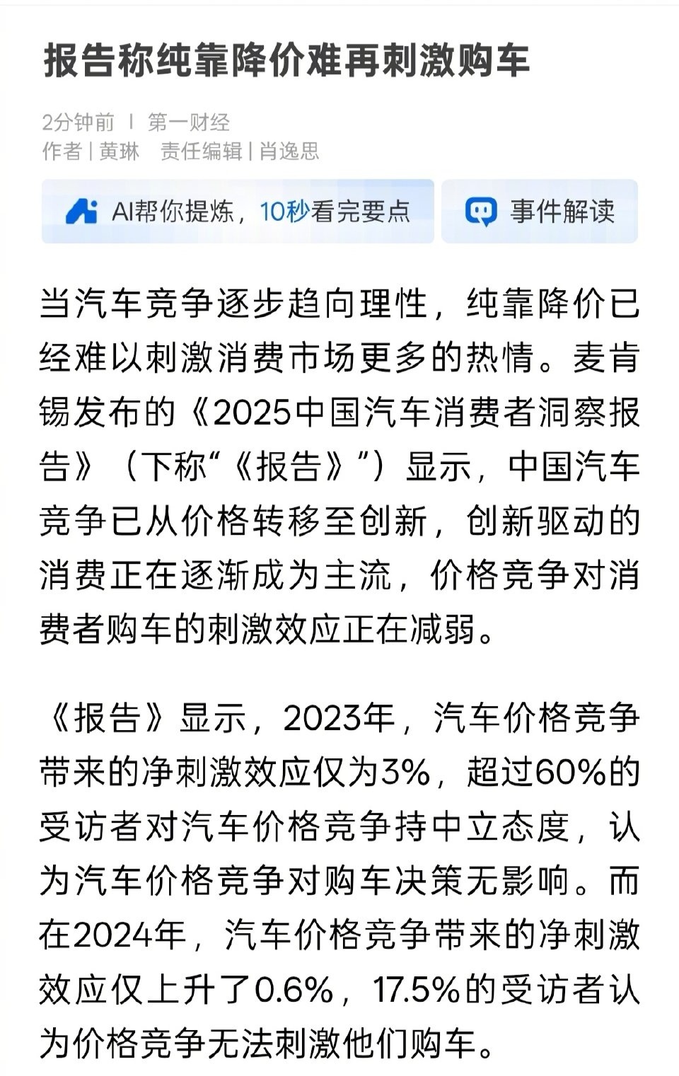 现在车市降价真不管用了!以前一降价大家就抢,现在再大优惠也没人买账,超六成消费者对降价没感觉,甚至觉得“降了也不买”。更要警惕的是,新车定价太低没好事!车企赚不到钱,就会在用料和售后上缩水,网上好多人吐槽低价车,要么续航虚标,要么零件容易坏,修车还麻烦 。2024年汽车行业利润率才4.4%,连研发新技术的钱都挤不出来,最后吃亏的还是咱们消费者。现在买车,大家都盯着真本事!不管是靠谱的三电系统、智能驾驶辅助,还是扎实的安全配置,这些才是核心 。那些肯在技术上投入、品控有保障的车型,才值得真金白银买单!