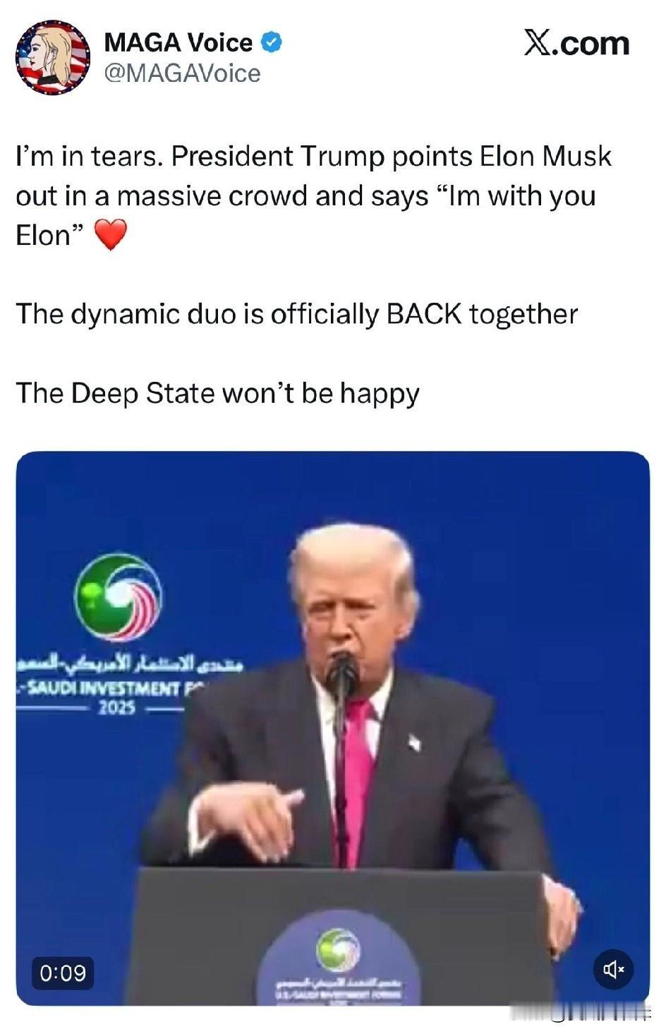 MAGA Voice:我哭了。President Trump 在人群中指着 Elon Musk 说:“Elon,我与你同在。” 活力二人组正式回归! 深沉政府不会高兴的。