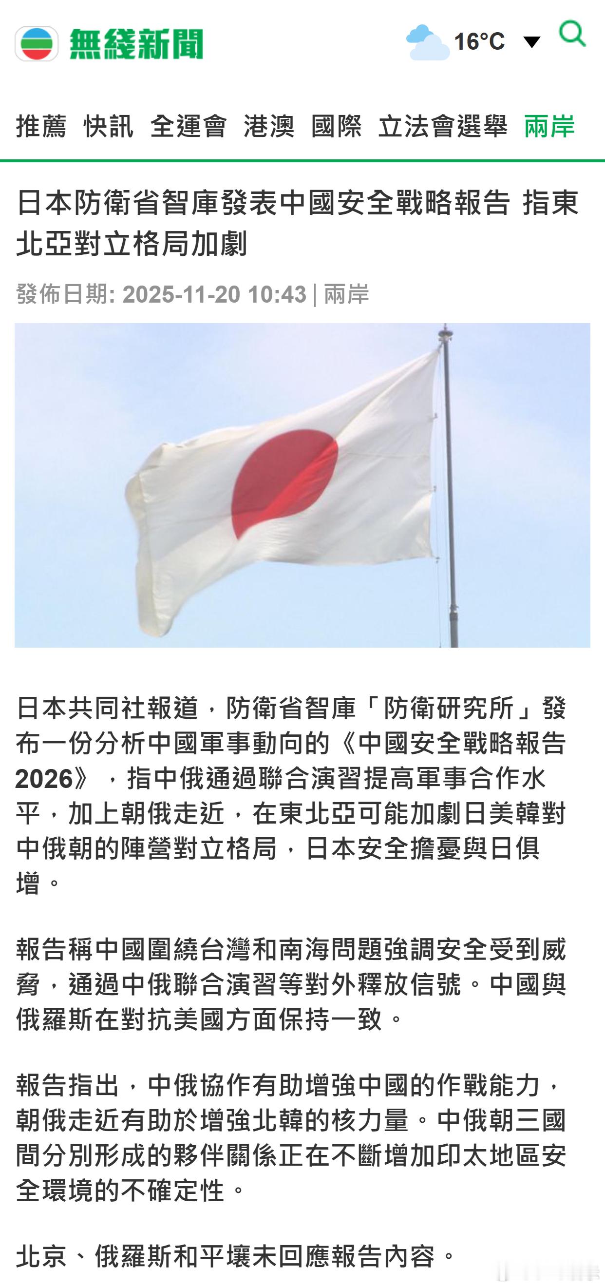 日本防卫省智库发表中国安全战略报告指东北亚对立格局加剧