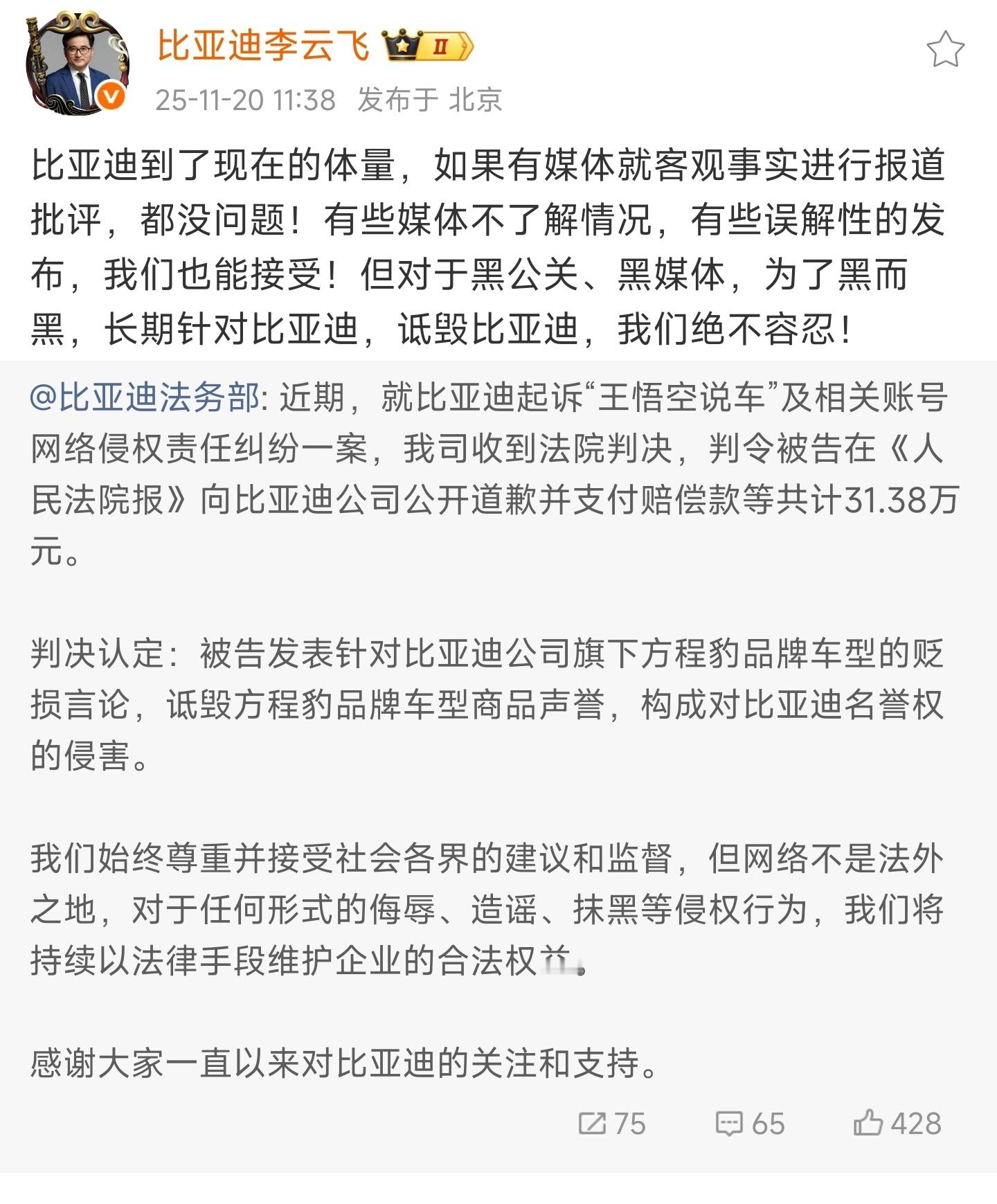 李云飞一直在重申态度,比亚迪对于黑公关、黑媒体的态度非常坚定,就是干。