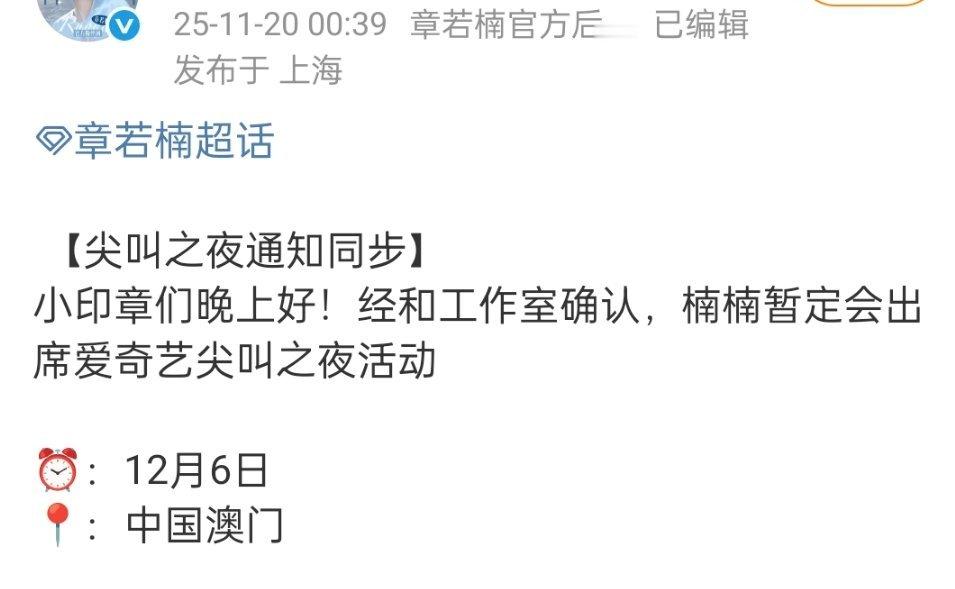 章若楠确认出席爱奇艺尖叫之夜活动!!