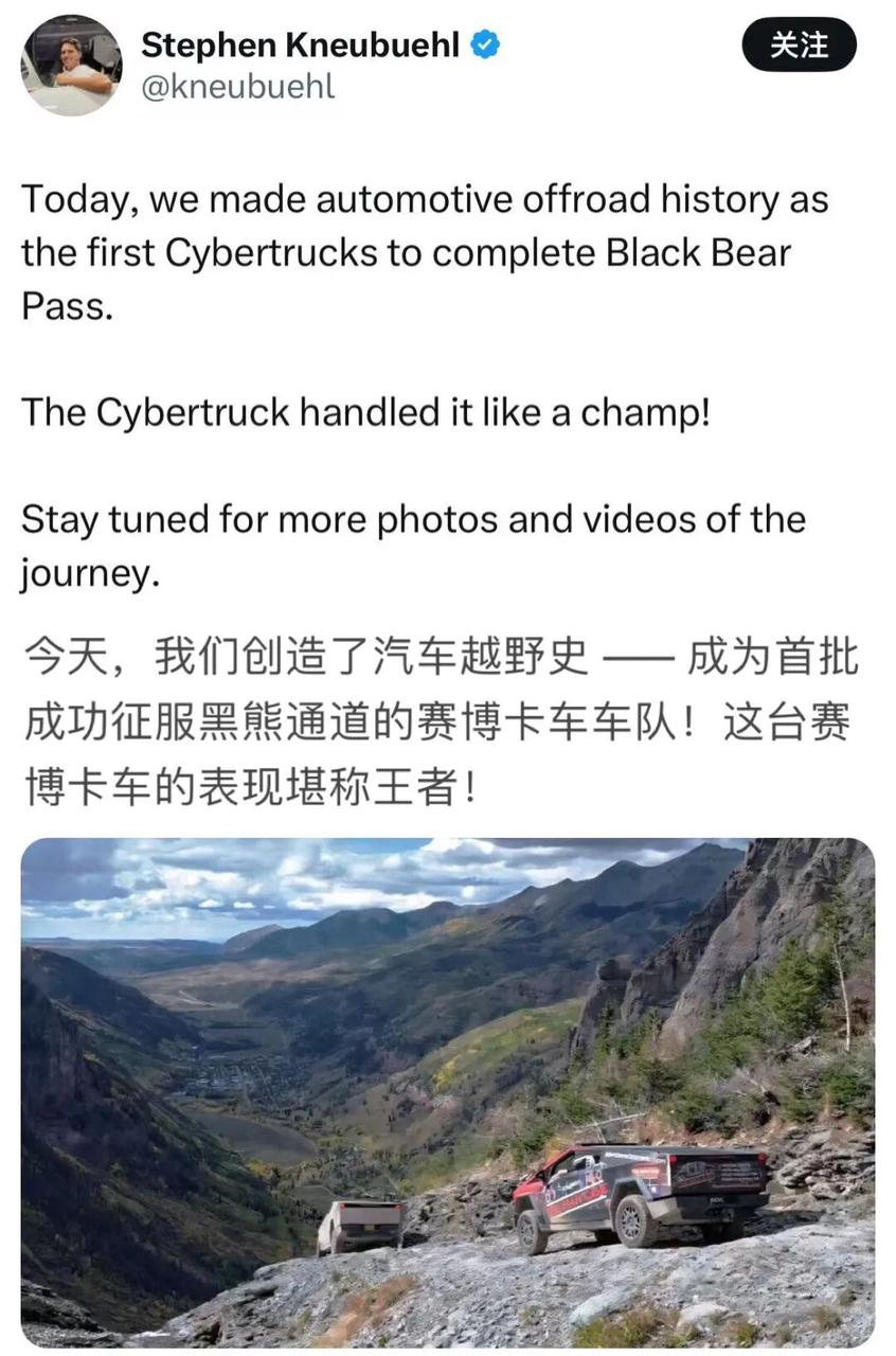 海外博主kneubuehl 与车友们驾驶特斯拉赛博越野旅行车,成功穿越美国科罗拉多州著名的黑熊关口,成为首批征服这一危险越野路段的电动车队。据了解,黑熊关口被公认为科罗拉多州最危险的越野路线之一,路况复杂且对车辆性能要求极高。此次行程从特柳赖德出发,需环绕山区行驶约63英里(约101公里),全程伴随着多次剧烈的海拔起伏。其中核心越野路段长10英里(约16公里),海拔攀升超过2500英尺(约762米),随后又急剧下降4000英尺(约1219米)返回起点。这样的极端路况对车辆的动力、操控与可靠性提出了全方位的考验。车辆在此次行程中出色的能效表现,也让车友印象深刻。整个6小时的行程覆盖了多数越野路段,仅消耗了30%的电量,期间不仅维持屏幕开启、空调运转等基础功能,还同步为手机、对讲机充电,并为迷你冰箱供电。同行的车友Man_Cave_Mike 坦言,完成黑熊关口穿越是他购入赛博越野旅行车后的重要目标。尽管当日降雨增加了行驶难度,但车辆的强大表现完美适配了这一极端场景,让他忍不住赞叹:“赛博越野旅行车就是为此而生的!”