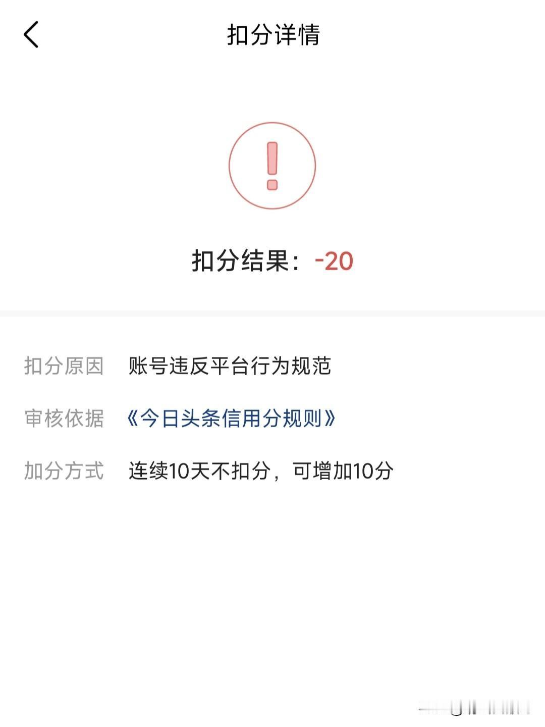今天午休起来就收到了扣分通知,通知里也没列举哪个作品涉及违规,就说我最近持续违规,一下子扣了20分。仔细阅读了一下头条的《今日头条低质账号专项治理公告》,估计是平时写微头条的时候用多了性感美女的图片,因此被系统判定为“低俗引流”吧。可是话说回来,有时候一天天发的作品流量太少了,一天下来展现量都不到一千,不发一两个美女图片的作品,完全没流量。哎……,看样子以后还是少发带美女的图片,不然说不定哪天就不是扣分那么简单咯!
