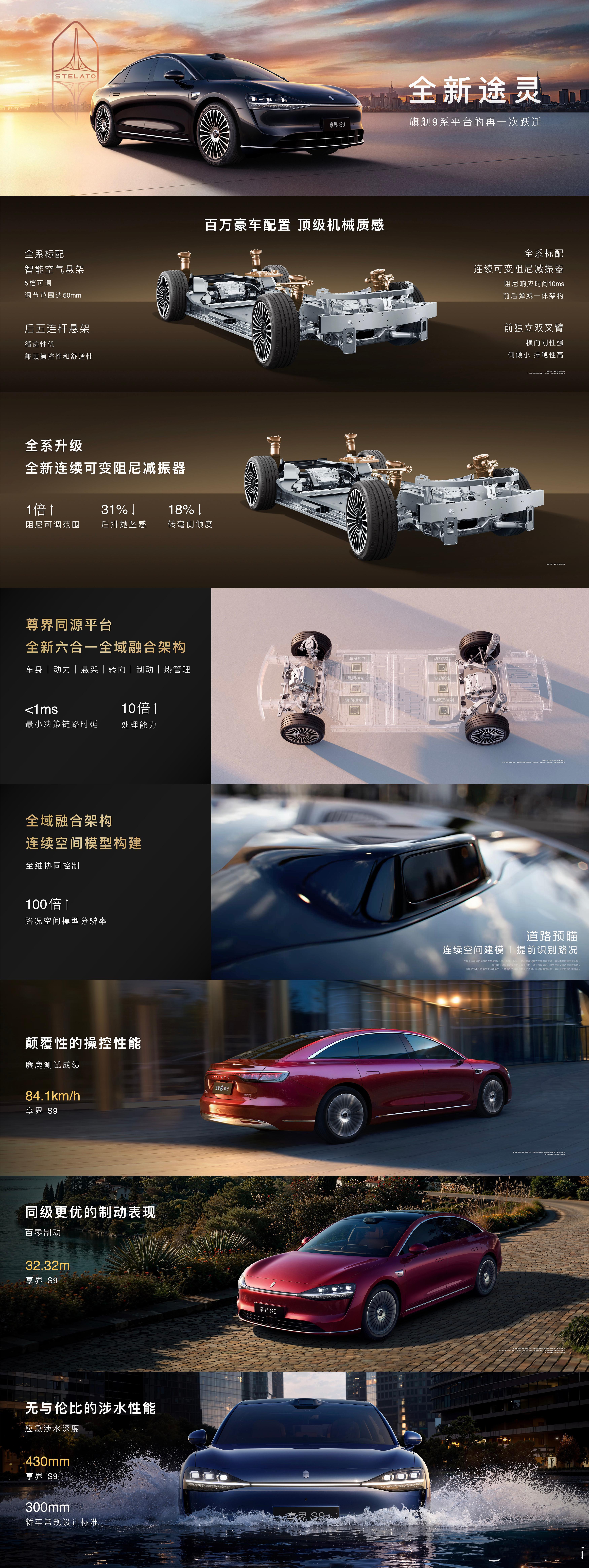 全系标配智能空气悬架和全新连续可变阻尼减振器,升级尊界同源全新六合一全域融合架构,支持连续空间模型构建,实现全维协同控制,操控更稳健,体验更舒适!