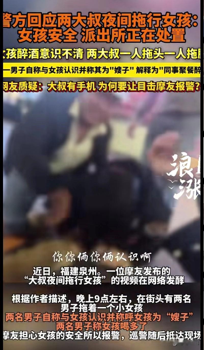 这视频看得我手心都攥紧了!福建泉州深夜,俩大叔“拖”着醉酒没意识的女孩走,一人拽头一人拽身子,说认识还喊“嫂子”,结果自己有手机却让摩友报警——这操作谁看了不犯嘀咕? 好在摩友留了心眼报了警,现在警方说女孩安全、正在处置,但这事儿越想越后怕:要是没人管,这姑娘会咋样? 不管认不认识,把醉酒的人这么硬拖,本身就离谱!真关心的话,不该是好好扶着或者联系家属? 希望警方查清楚到底咋回事,也提醒姑娘们:在外喝酒别让自己断片,真要醉了,得有靠谱的人陪着!