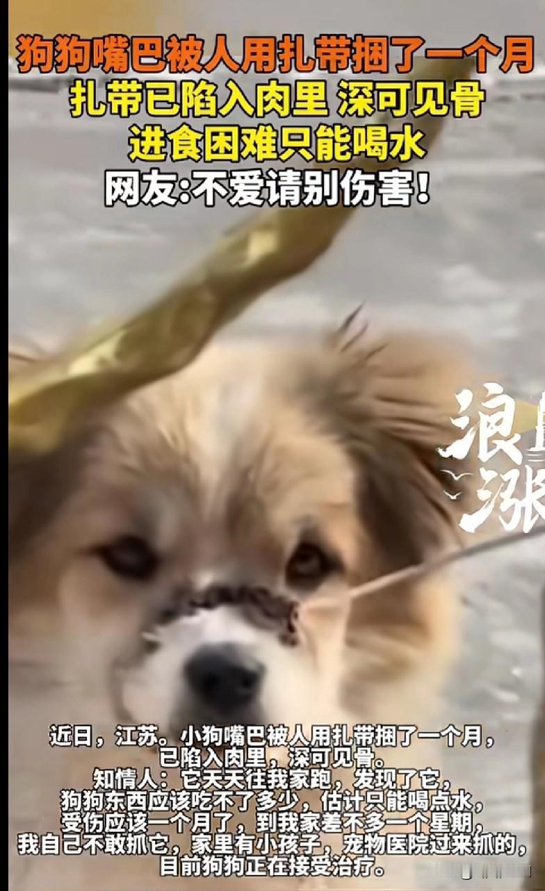 这事儿看得我心揪得慌!江苏这只小狗也太遭罪了——嘴被扎带捆了整整一个月,扎带都嵌进肉里、深能见骨,只能勉强喝点水,饿了这么久得多疼啊! 好在有好心人发现它总往家里跑,虽然自己不敢抓(家里有娃能理解),但立刻叫了宠物医院来救。现在小狗终于在治伤了,希望它能熬过来。 真的想骂那个捆它的人:不爱可以离远点,为啥要下这种狠手?毛孩子又不会说话,疼也只能憋着。 咱们平时看见流浪动物哪怕不帮,别伤害行吗?它们只是想活着而已啊。