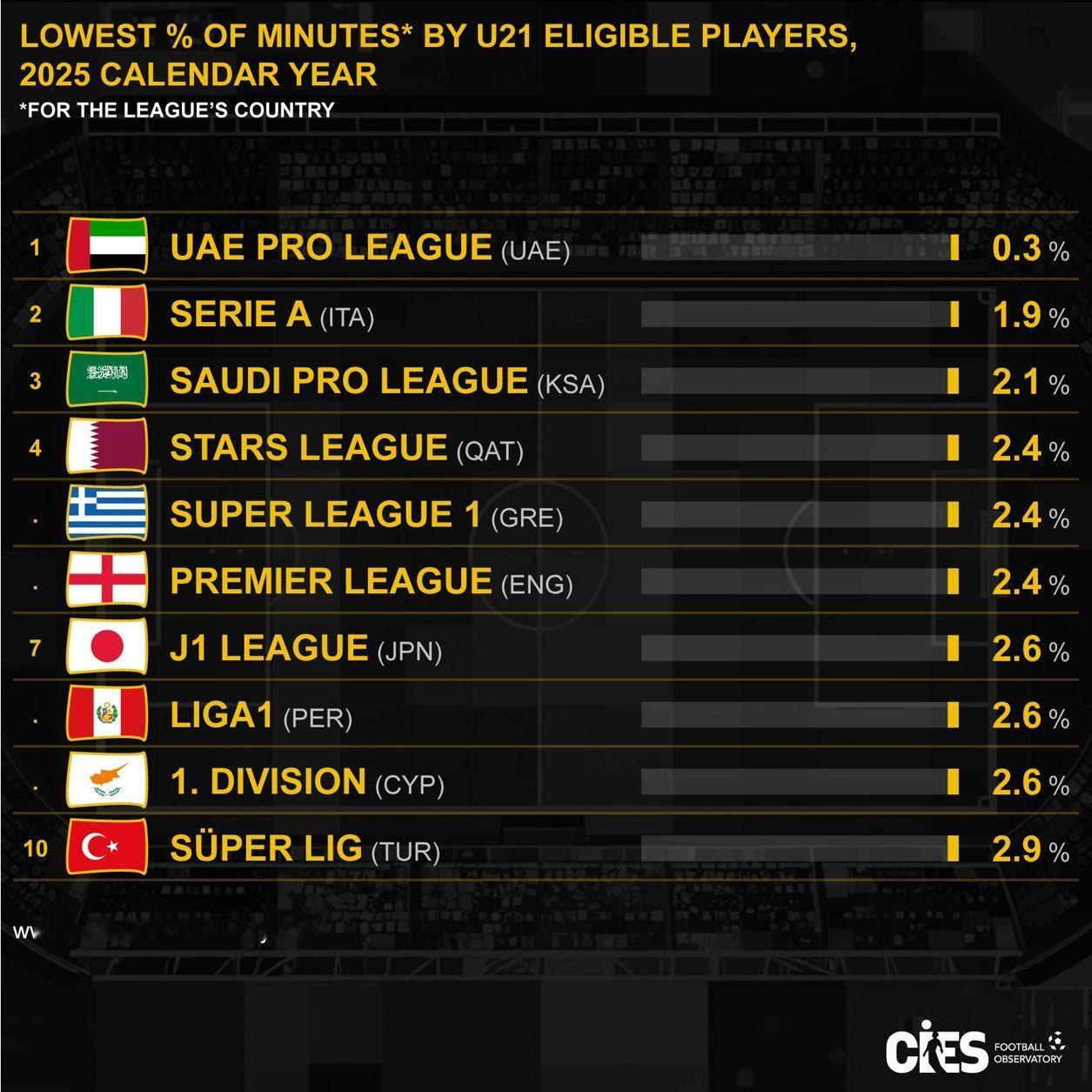 【意甲不仅现在在衰落 未来也不求行】在U21球员的使用时间上,意甲联赛全球第二少! 这是CIES 最新出炉的2025年全球各大联赛U21球员出场时间数据,最少的是阿联酋联赛,然后是意甲联赛,第三是沙特,英超与卡塔尔联赛、希腊联赛并列第四…… 英超作为世界上最成功的联赛,年轻球员出场时间少可以理解,西甲、德甲、法甲,甚至是葡超这些联赛都没有出现在前十的榜单中,唯有意甲,这么扎眼…… 阿莱格里曾在2018年谈过意大利球员的断档情况: “我们到底在教孩子们什么?穿2号球衣的孩子必须把球传给穿3号球衣的孩子,3号传给4号,4号传给7号,以此类推,直到传到9号。创造力呢?谁来教孩子如何培养天赋?我已经厌倦了听到‘没有天才涌现’这种说法。 这只是部分事实。意大利有能力培养出优秀的球员,但只是少数。而且通常情况下,他们都是自发成长起来的。 在青训营里,工作重点是把年轻球员机械化。我们把他们变成了文员——被困在固定的模式和动作中。创造力呢?我们已经把它忘了。让我们回归初心,教孩子们在快乐中踢球吧。” 法乔利曾经算是意大利阵中为数不多有创造力的球员了,但是负面新闻让他很难再有作为。如今的意大利,创造力就指着和法乔利半斤八两的托纳利了。现在意大利的U21还有什么人才吗?其他国家的U21人才更不愿意来“养老联赛”练级了