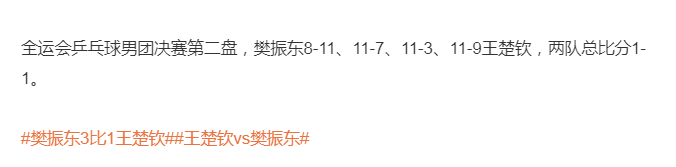 王楚钦没有打过樊振东1比3输了,当然了,王楚钦真的是不容易这一年的比赛每一战从第一天打到最后一天,再不停地奔赴下一个赛场,一人斩获单打6金1银2铜、混双2金、男双2金,成绩斐然小胖樊振东,更是没的说了,全运会单打一次都没有输过樊振东强的可怕啊啊啊,不愧是邓亚萍口中的T0级选手!太牛了