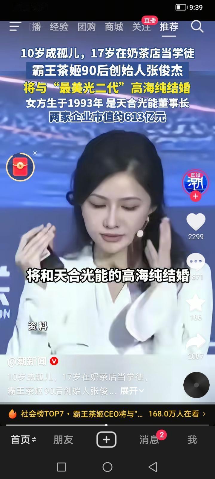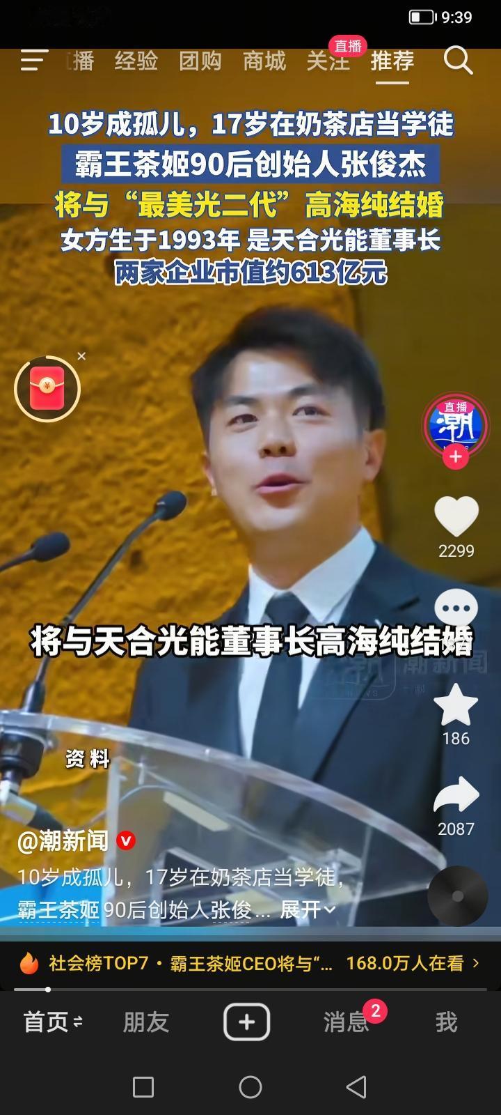 许多女孩做梦都想嫁给霸总,可真实的霸总,他们的另一半那也是了不得的人物。2025年11月20日有知情人士确认,霸王茶姬创始人张俊杰将与天合光能联席董事长高海纯结婚,网传请柬显示两人婚礼定在12月15日,举办地是高海纯的家乡常州的中吴宾馆 。 两人同为1993年出生,这场联姻堪称茶饮新贵与光伏豪门的跨界结合。张俊杰是草根逆袭的典范,从奶茶店基层店员起步,2017年创立霸王茶姬,如今该品牌门店超6000家且已登陆纳斯达克 。高海纯毕业于美国布朗大学,被称为“最美光二代”,2017年加入天合光能后从基层逐步晋升,如今已是天合光能联席董事长,和父亲共同执掌这家企业 。截至11月20日,霸王茶姬与天合光能两家公司总市值合计约613亿元 。霸王茶姬 张俊杰 高海纯 天合光能 西安路霸王茶姬 桐柏霸王茶姬 豪门