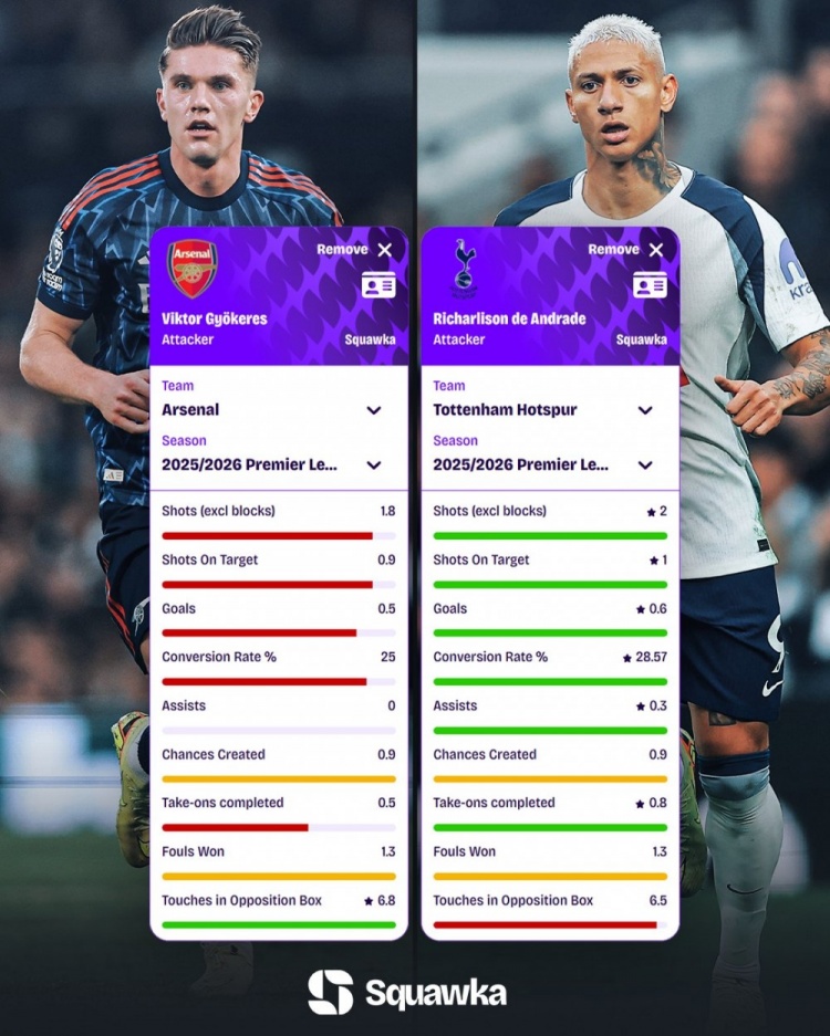 直播吧11月21日讯英超即将战火重燃,北伦敦德比备受瞩目。数据机构squakwa也对比了两队中锋约克雷斯和里沙利松本赛季英超场均关键数据情况,后者多项数据占优。
