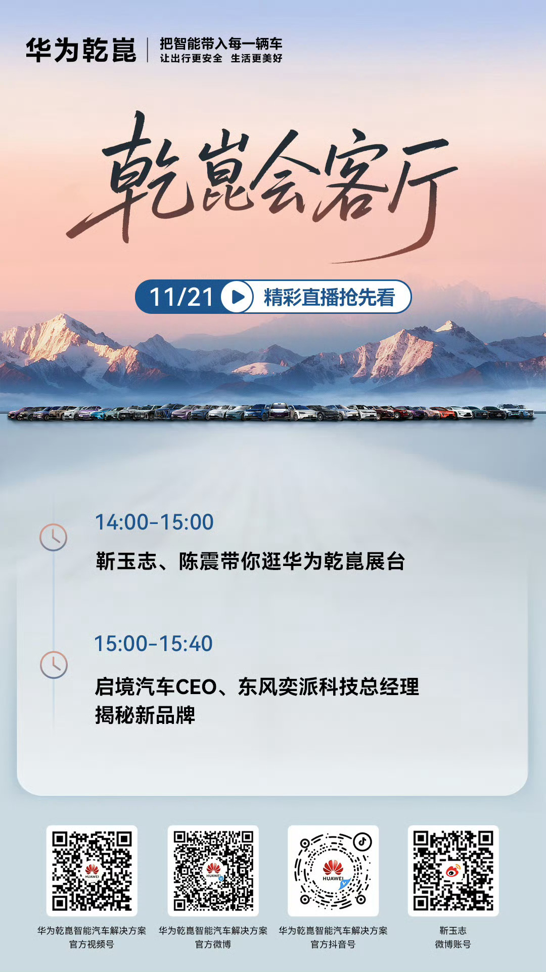 11月21日14:00,锁定 直播间,《乾崑会客厅》带你逛广州国际车展的华为乾崑展台!更有两位CEO做客直播间,重磅揭秘全新品牌。全程高能,敬请期待!