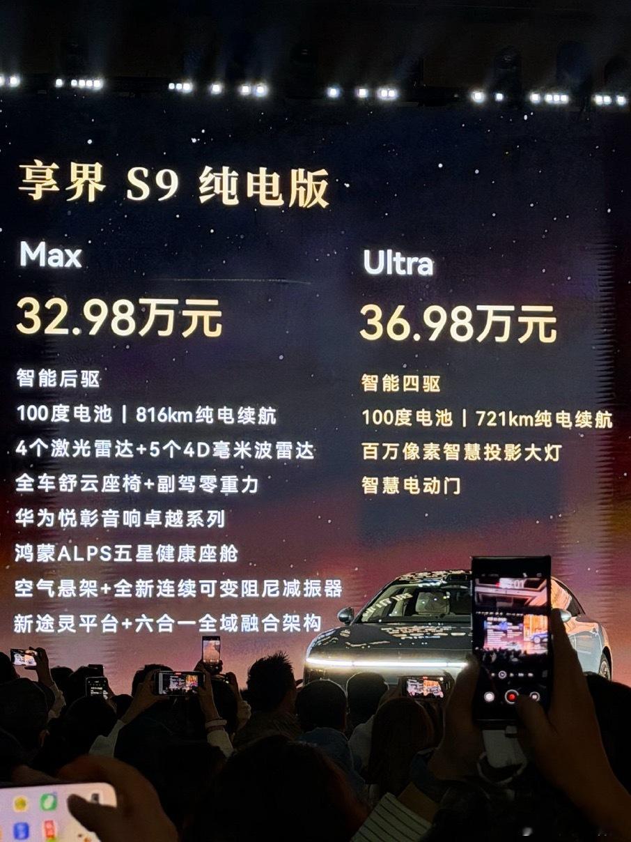 新款享界S9上市,售价区30.98-36.98万作为改款车型,新款享界S9换装全新“寰宇之星”车标,星云尾灯造型也采用享界S9T的设计动力上提供增程和纯电可选,其中增程版CLTC纯电续航最高372km,纯电版CLTC纯电续航最高816km并标配空气悬架和CDC可变阻尼减振器同时,新车搭载华为A,标配4颗激光雷达和5个4D毫米波雷达