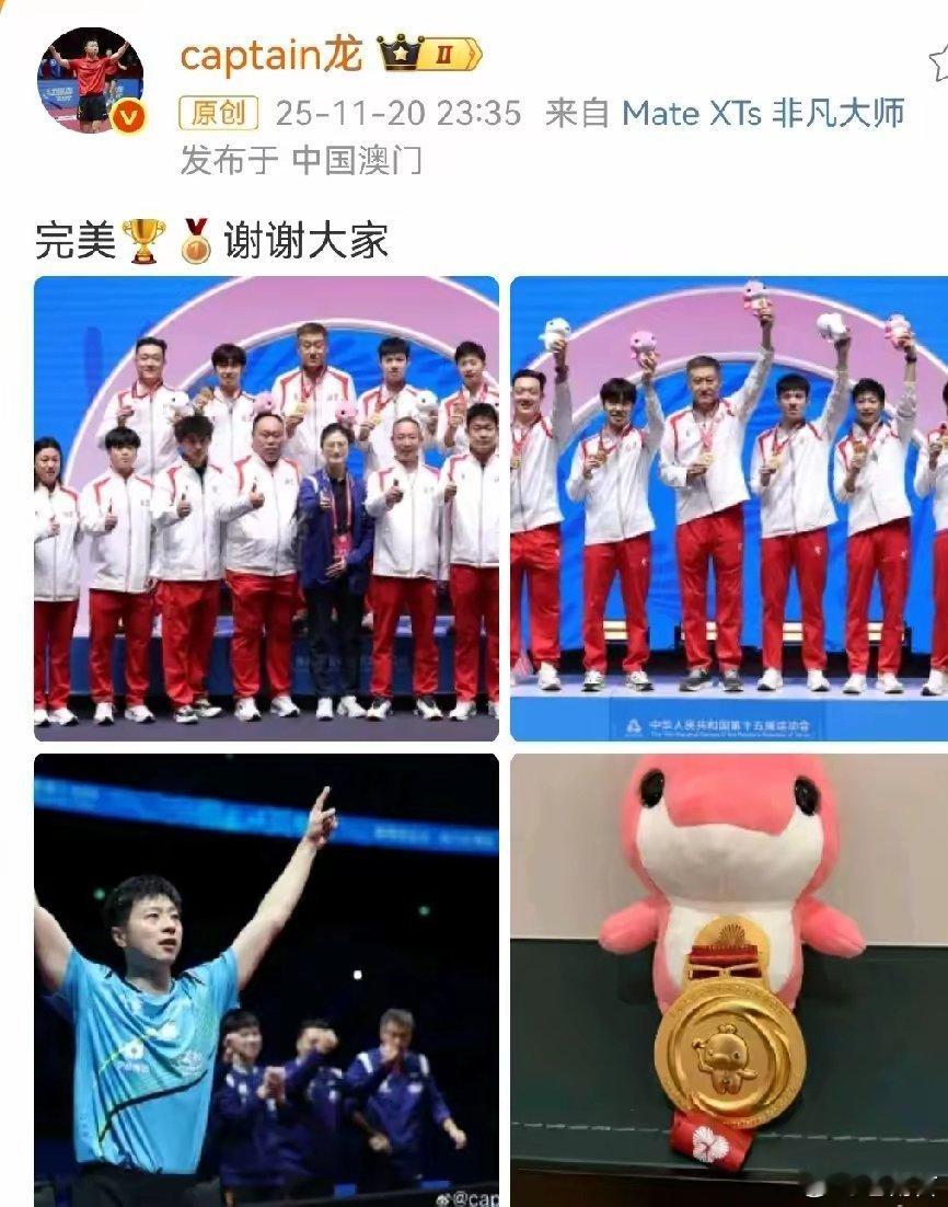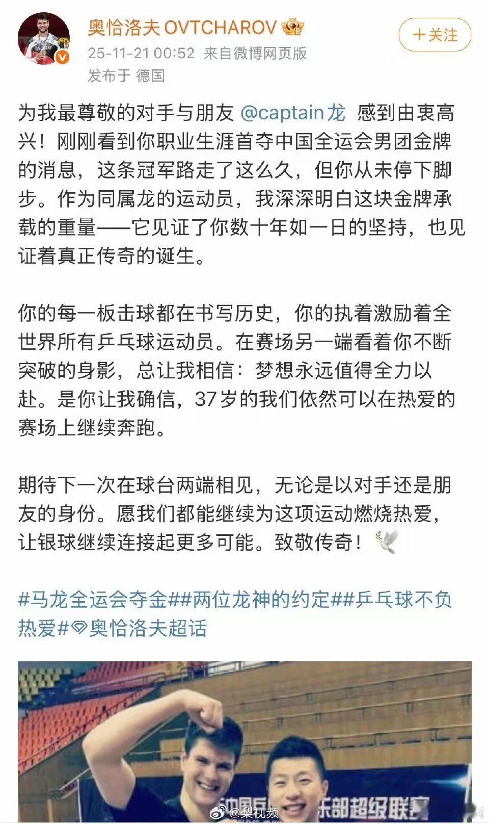 马龙全运会男团夺金后发文:完美,谢谢大家!曾经的老对手奥恰洛夫也发文祝贺马龙夺金。我们永远的龙队,永远当打之年的龙队,谢谢龙队带给我们国乒球迷的感动。谢谢马龙的坚持和热爱,永远期待你的赛场,永远支持龙队!