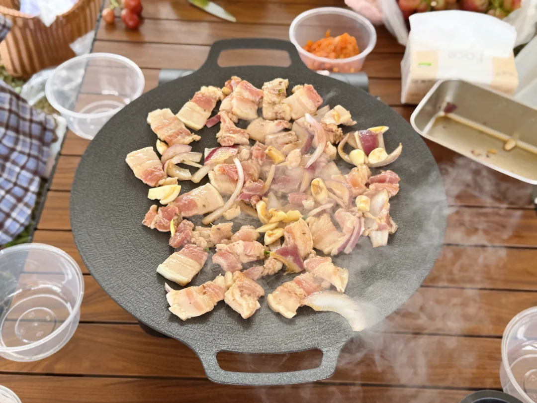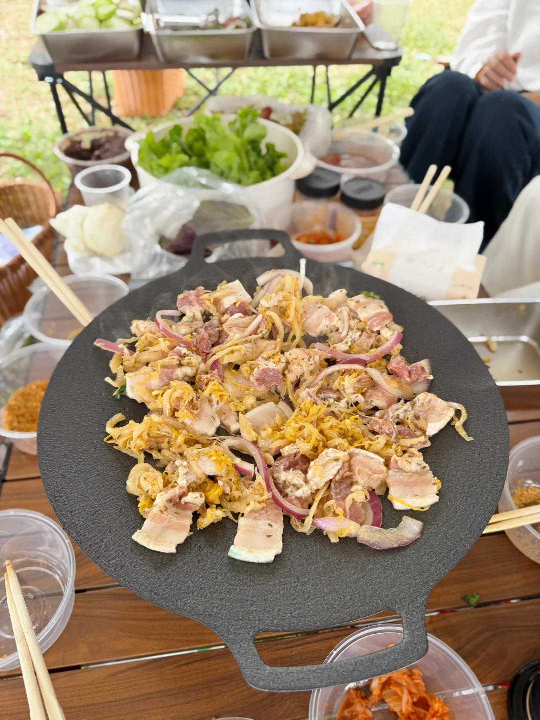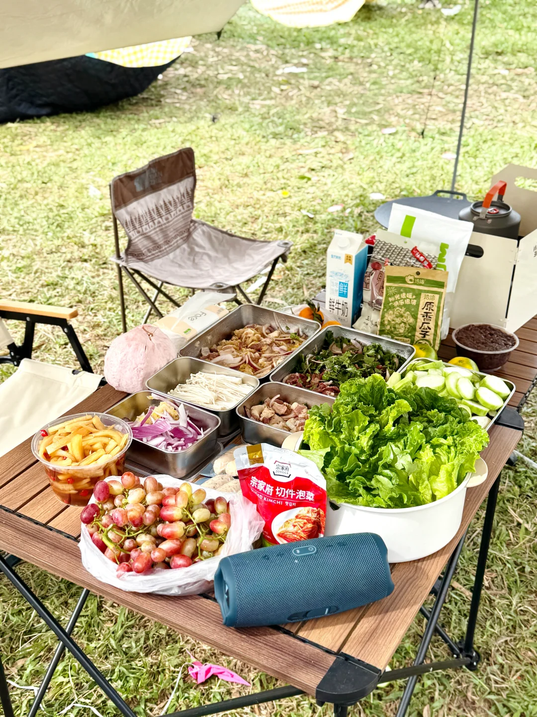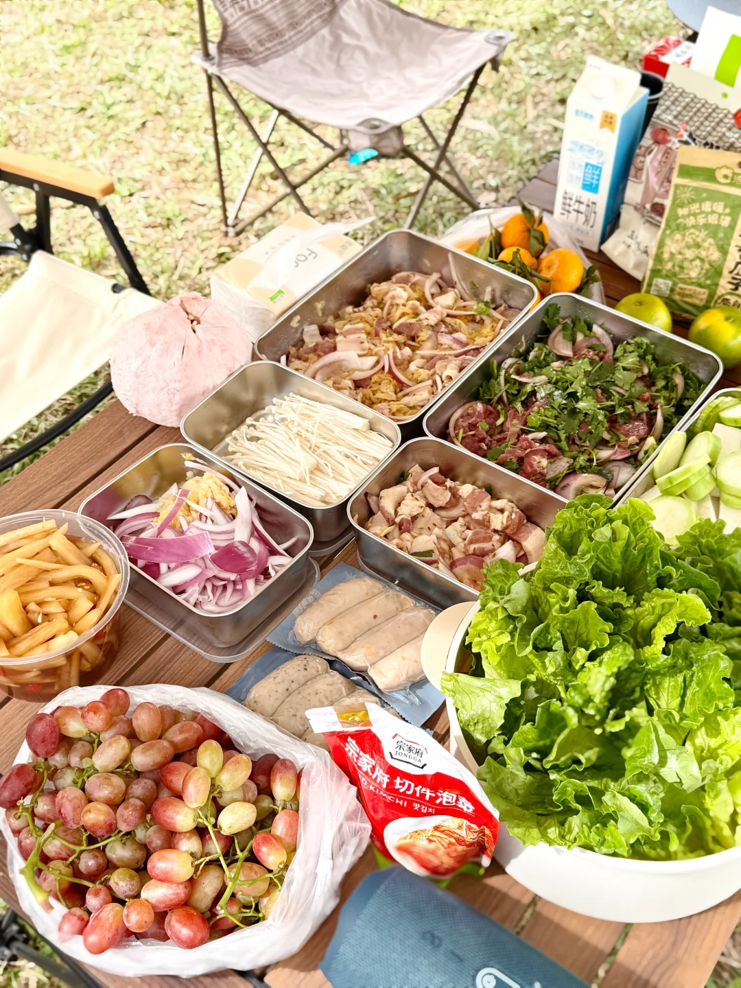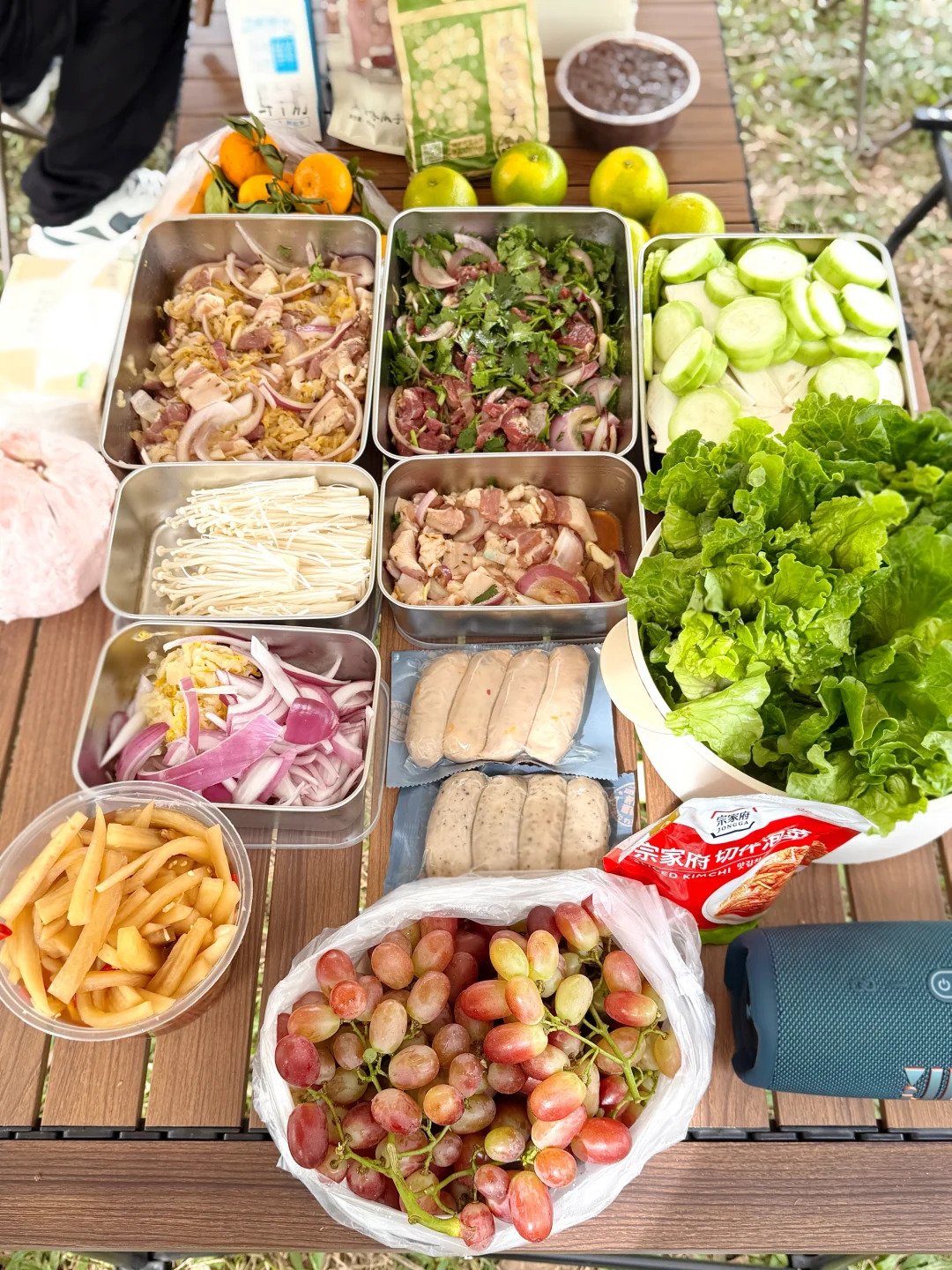 今天南宁的太阳是开了“温柔滤镜”吧 20多度的天气🌡️ 江边吹着风 和朋友支起小桌子 烤盘一摆直接香迷糊! 今天准备了一些简单又巨好吃的菜[点赞R] [彩虹R]酸菜五花肉 [彩虹R]香菜牛肉 [彩虹R]黑椒烤肠 [彩虹R]素菜:杏鲍菇、西葫芦、金针菇、丝瓜 还准备了小配菜:韩式泡菜、洋葱、酸萝卜 水果:柚子、葡萄、砂糖橘、冰糖橙 今天是快乐的“天气刚好+朋友在侧+烤肉管够”的日子✨是闪闪发光的日子✨