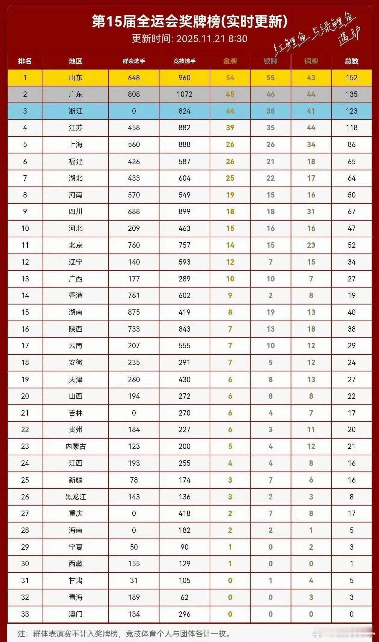 全运会奖牌榜山东遥遥领先第一山东、广东、浙江前三名江西4金4银8铜