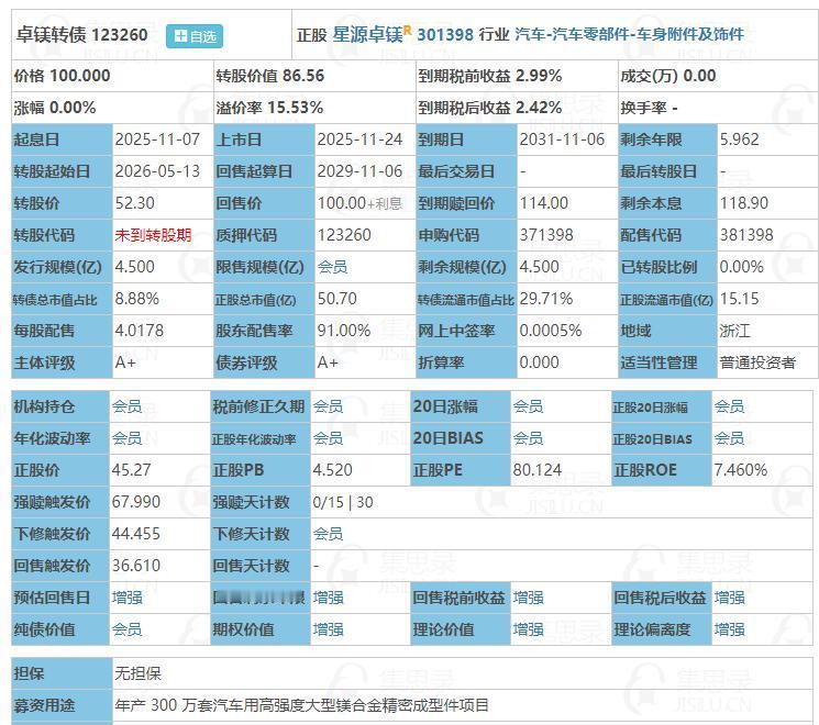 11月24日卓镁转债上市,根据当前市场情绪及可转债交易行情,卓镁转债上市时预计会有55%的溢价,预估上市价值为134元,上市首日基本是130元涨停开盘,可以看下午收盘前是否继续涨停决定去留。 卓镁转债为A+级转债,转股价值较低,纯债价值较低,正股盈利能力尚可,行业相关可转债的价格较好。股东配售率91%,上市首日流通市值约为1.78亿,上市首日的流通市值较大,可能会有较大的抛压,注意关注相关风险。