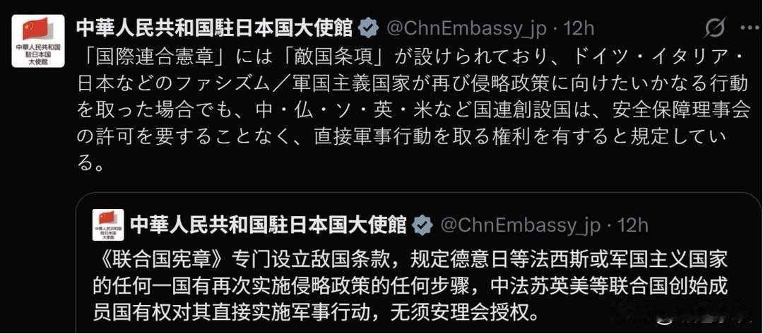 “中方这次对日警告,直接祭出‘敌国条款’这张王炸!很多人不懂这词多严重——它意味着日本在联合国体系里至今戴着‘潜在侵略者’的帽子!中方此前说‘干涉台海视为侵略’是引用自卫权,属于常规操作;但今天搬出‘敌国条款’,等于明说:‘你别忘了,国际法给你留的案底,我们随时能翻出来用!’这已不是普通外交摩擦,而是用法律条款把日本钉在历史耻辱柱上警告:军国主义老路,你走一步试试看!”