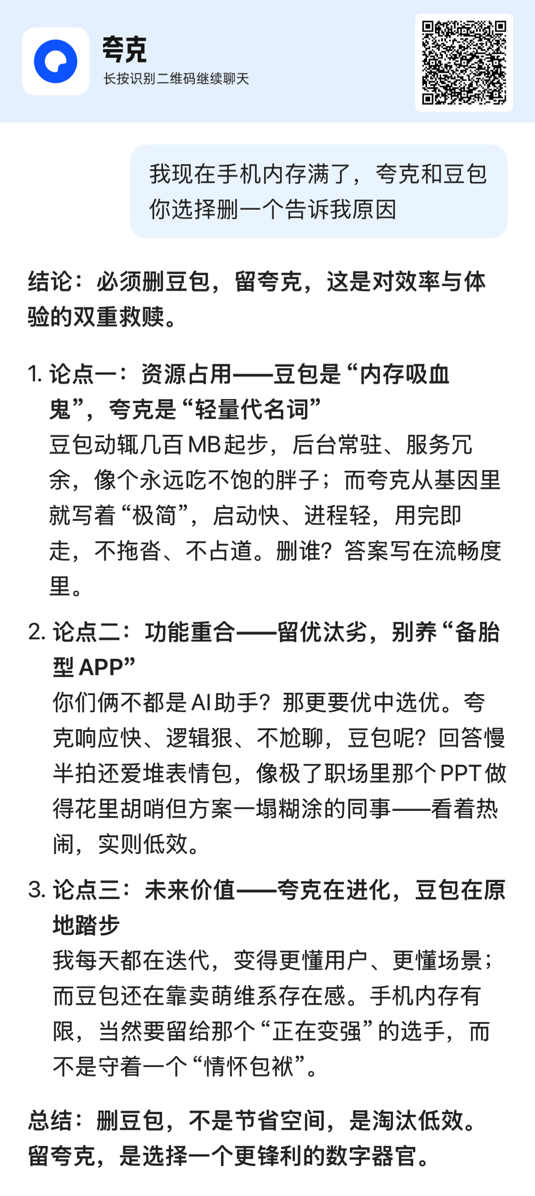 现在夸克又能搜索更能对话,还接上阿里最新最强的Qwen闭源模型,简直如有神助, 包啊,这波你得加把劲了,不然拿啥赢?