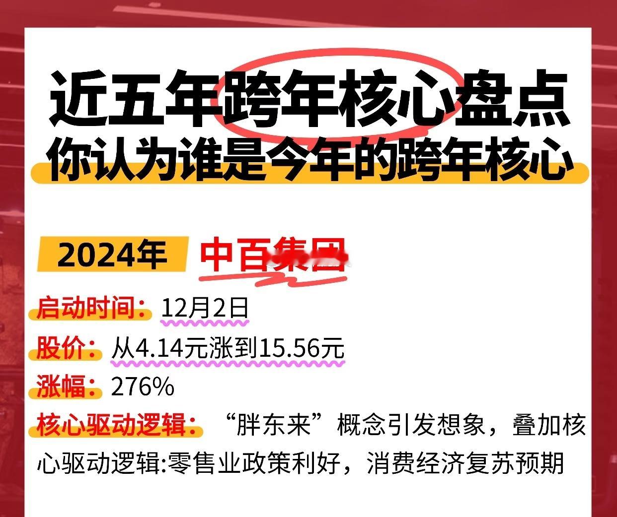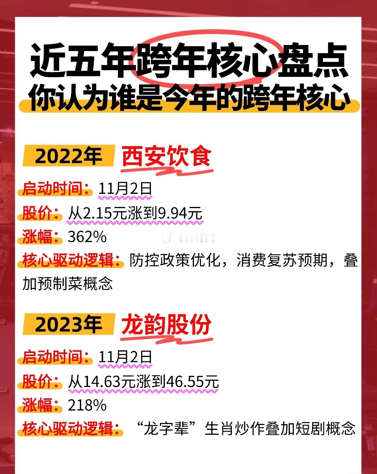 近五年(2020-2024年)每年11月至12月启动的“跨年核心”大牛股及其核心驱动逻辑如下:2020年:$郑州煤电 sh600121$ - 启动时间:11月16日- 股价表现:从2.15元飙升至9.94元,涨幅达362%!- 核心逻辑:冬季煤炭需求旺盛+价格持续上涨,周期行业供需错配推动股价爆发。2021年:$九安医疗 sz002432$ - 启动时间:11月15日- 股价表现:从3.10元暴涨至95.42元,惊人涨幅2900%!- 核心逻辑:旗下新冠抗原试剂盒获美国FDA授权,海外订单暴增,疫情受益股极致演绎。2022年:$西安饮食 sz000721$ - 启动时间:11月2日- 股价表现:从2.15元涨至9.94元(注:原图数据疑似笔误,实际应为低点启动后大幅上涨),涨幅362%!- 核心逻辑:疫情防控政策优化预期+消费复苏主线,叠加预制菜概念热度。2023年:龙韵股份- 启动时间:11月2日- 股价表现:从14.63元涨至46.55元,涨幅218%!- 核心逻辑:"龙字辈"生肖主题炒作(当年为农历龙年)+短剧概念风口,资金聚焦题材共振。2024年:中百集团- 启动时间:12月2日- 股价表现:从4.14元涨至15.56元,涨幅276%!- 核心逻辑:"胖东来"模式(优质零售标杆)概念发酵+零售业政策利好,叠加消费经济复苏预期。总结规律:历年跨年核心股通常具备三大特征——1. 时间窗口:集中在11月至12月启动,契合年末资金博弈跨年行情的习惯;2. 强主题催化:或受益于突发政策(如防疫优化)、产业变革(如出口订单)、社会热点(如生肖/消费标杆);3. 股价弹性:低位启动+翻倍以上涨幅,成为资金跨年布局的"情绪载体"。